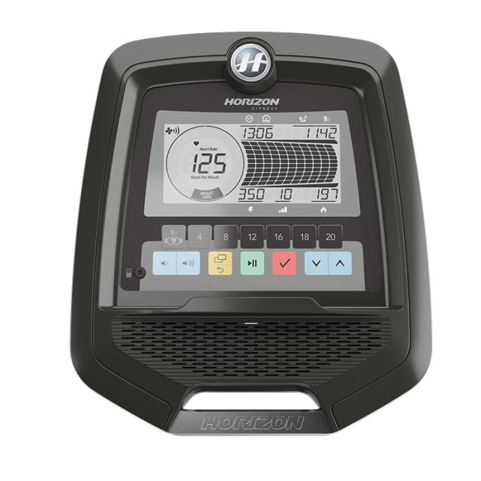 - Консоль з 5,5-дюймовим LCD дисплеєм відображає: час, дистанцію, калорії, пульс, графік навантаження та інше.