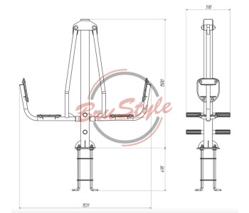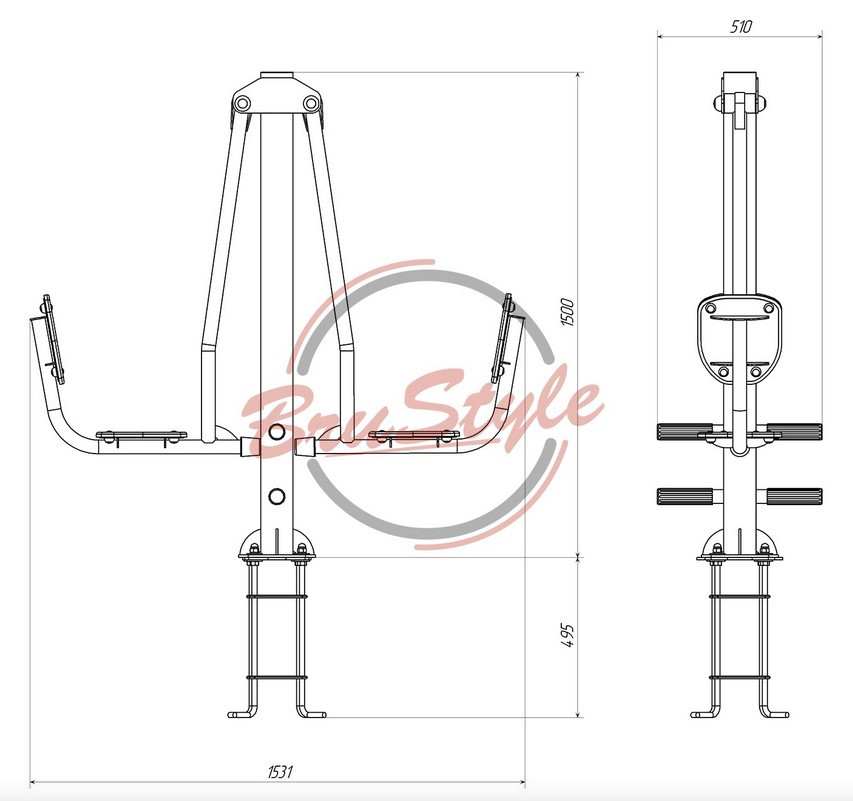 Складається вуличний горизонтальний тренажер «Жим ногами» BS100 зі сталевого каркаса, пофарбованого полімерними фарбами. Вибір комбінації кольорів тренажера залишається за замовником. З вибором необхідного кольору вуличного обладнання допоможе шкала (каталог, колірний стандарт) з таблиці кольорів RAL.