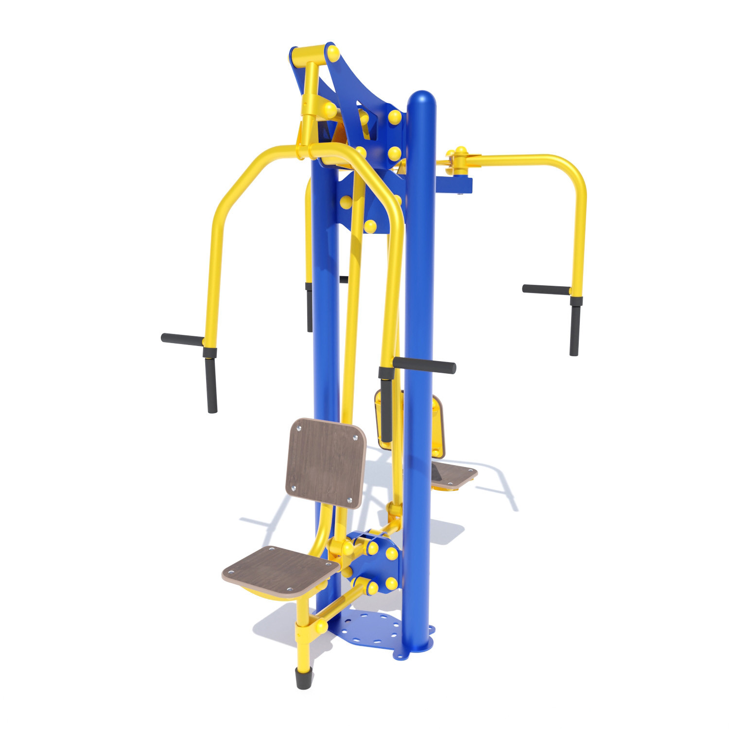 Вуличний тренажер Батерфляй – жим від грудей SG149 призначений для тренування двох людей. Баттерфляй застосовується для розвитку м’язів грудей без вправи жим лежачи. Крім того, він качає трапецію та задні дельти, а також м’язи обертачі плеча. Вправи на цьому тренажері не створює навантаження на ліктьові суглоби, невисоке навантаження та на плечовий суглоб у порівнянні з жимом лежачи. Тому заняття на батерфляй тренажері вважаються найбезпечнішим способом прокачування грудних м’язів. При жимі у тренажері на груди тренуються м’язи: грудні, трицепси, передні дельти. Будь-які жими на грудні м’язи, крім грудей, залучають ще трицепс і передні дельти. Так відбувається тому що будь-який жим – це базове, мультисуглобове, вправа в якому працює два суглоби: ліктьовий (працює трицепс) та плечовий (працюють грудні та дельти). Конструктивні особливості та матеріал тренажера дозволяють посилено його використовувати цілий рік. Складається він із потужної несучої рами та зручних важелів. Всі вуличні тренажери мають зносостійке до всіляких погодних умов, ультрафіолетового випромінювання – полімерне барвисте покриття та антивандальну структуру.
