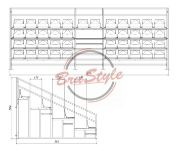 Настил підлоги та сходових маршів – металевий рифлений лист (можливе використання фанери з покриттям). Наявність бічних та задніх огорож забезпечує безпеку глядачів при вході та виході з трибун. Трибуна може бути піднята над рівнем основи до 1500 мм (для зручності огляду через борти хокейної коробки, рекламні щити та ін.)