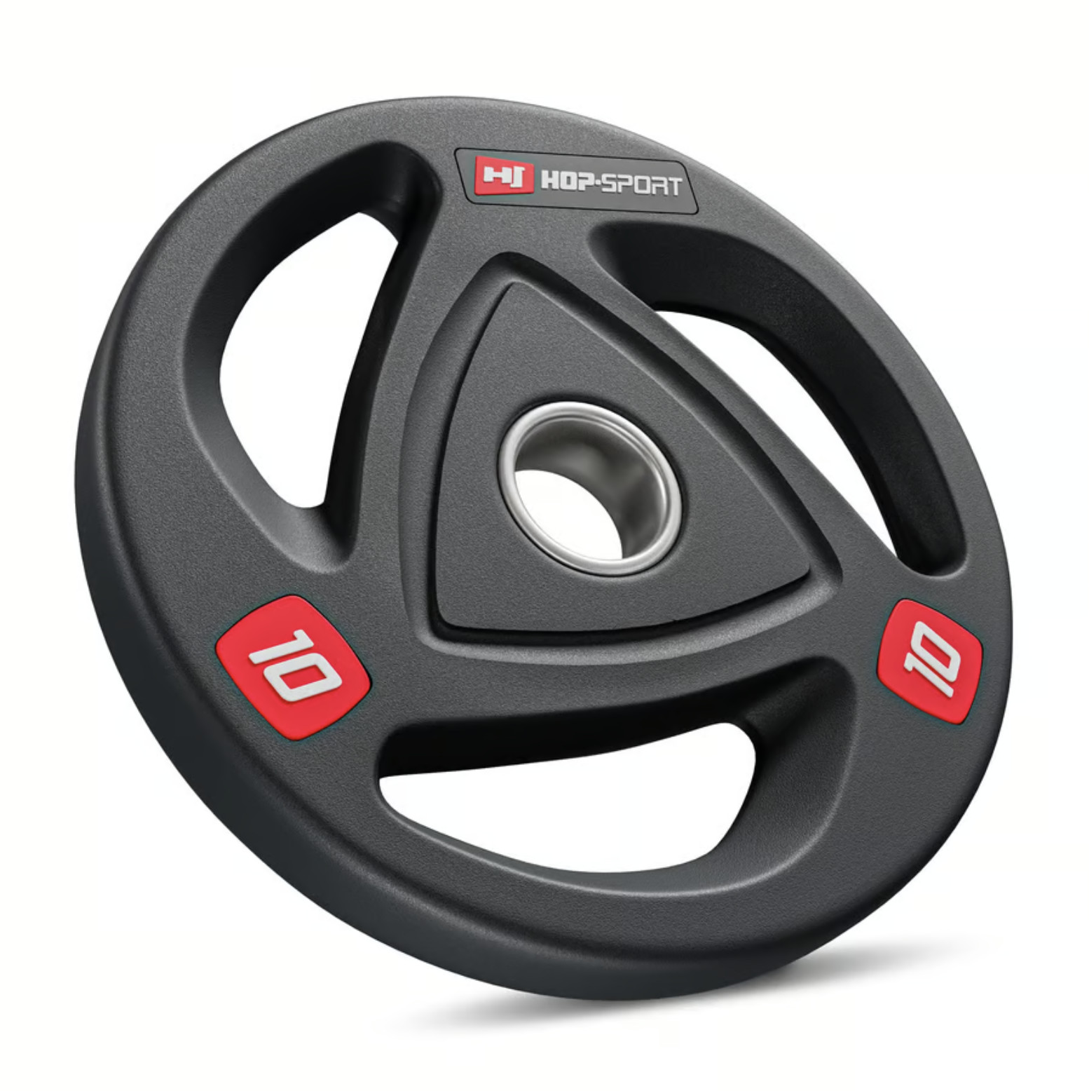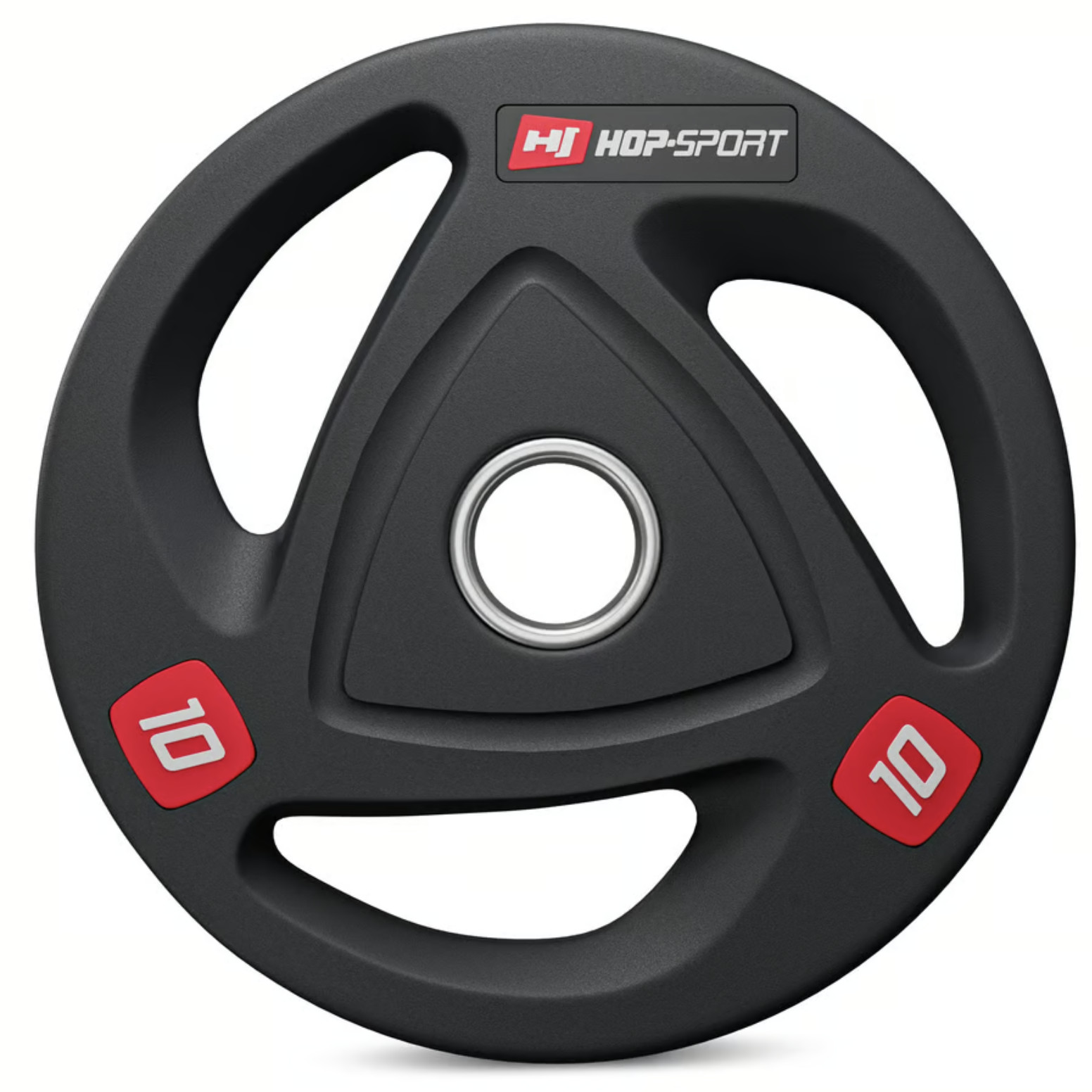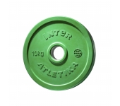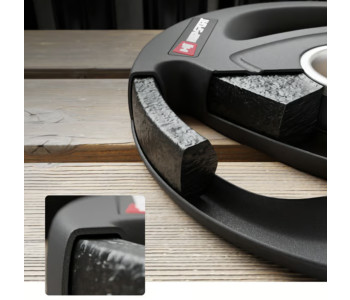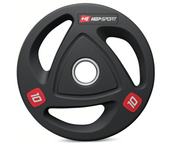 Олімпійські диски 10 кг виготовлені з прецизійного чавуну, покриті антиковзким шаром міцної гуми, яка ефективно амортизує диски при їх падінні і додатково заглушає звуки при падінні. Кільце з нержавіючої сталі в центрі диска з діаметром 51 мм гарантує їм високу міцність і забезпечує точну посадку на штангу. Вага витиснена на дисках, що спрощує їх ідентифікацію, а також спеціальні пази унікальної форми, що виконують роль ручок та підвищують комфорт використання.