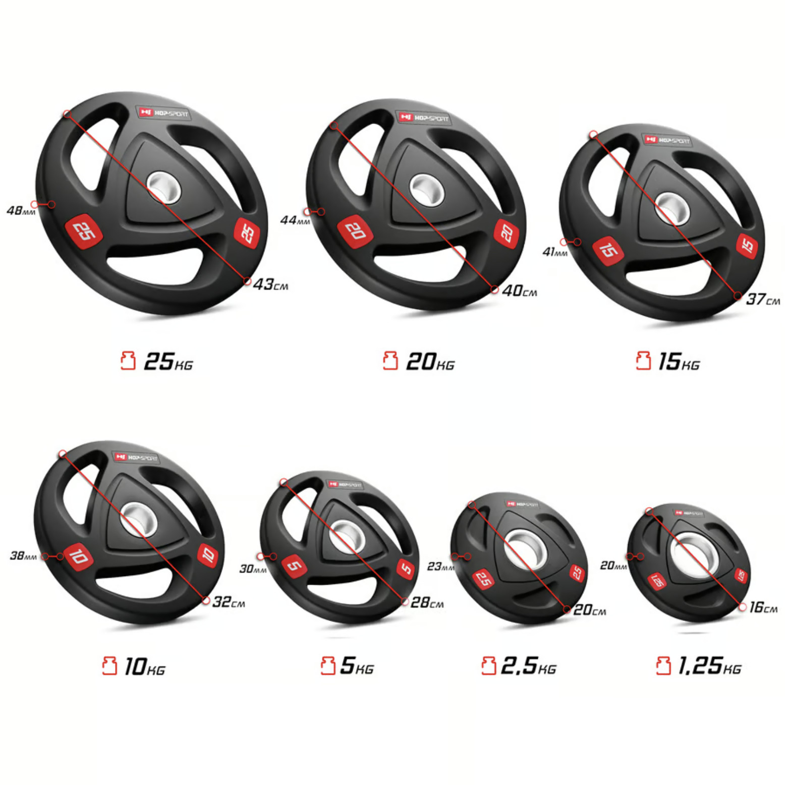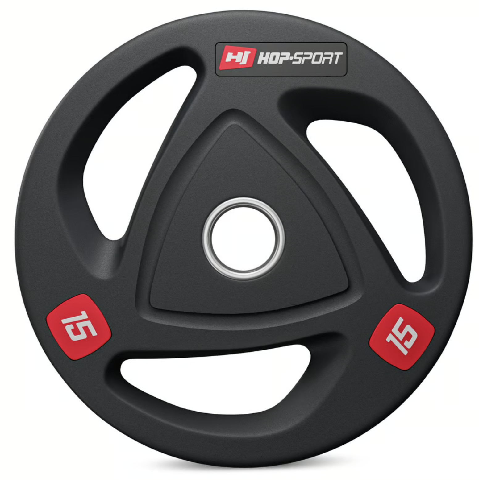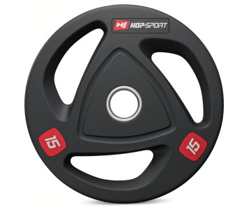 Олімпійські диски 15 кг виготовлені з прецизійного чавуну, покриті антиковзким шаром міцної гуми, яка ефективно амортизує диски при їх падінні і додатково заглушає звуки при падінні. Кільце з нержавіючої сталі в центрі диска з діаметром 51 мм гарантує їм високу міцність і забезпечує точну посадку на штангу. Вага витиснена на дисках, що спрощує їх ідентифікацію, а також спеціальні пази унікальної форми, що виконують роль ручок та підвищують комфорт використання.