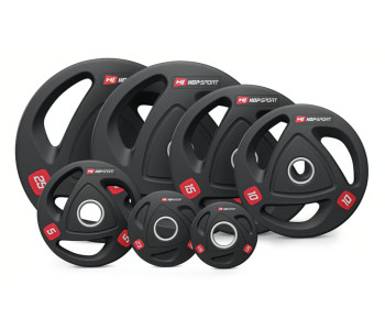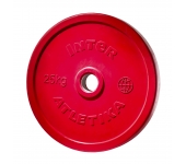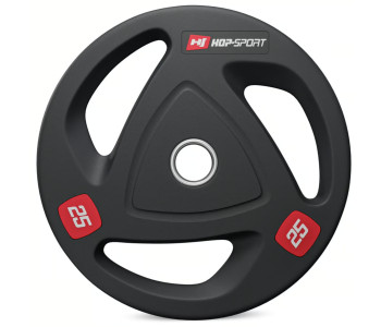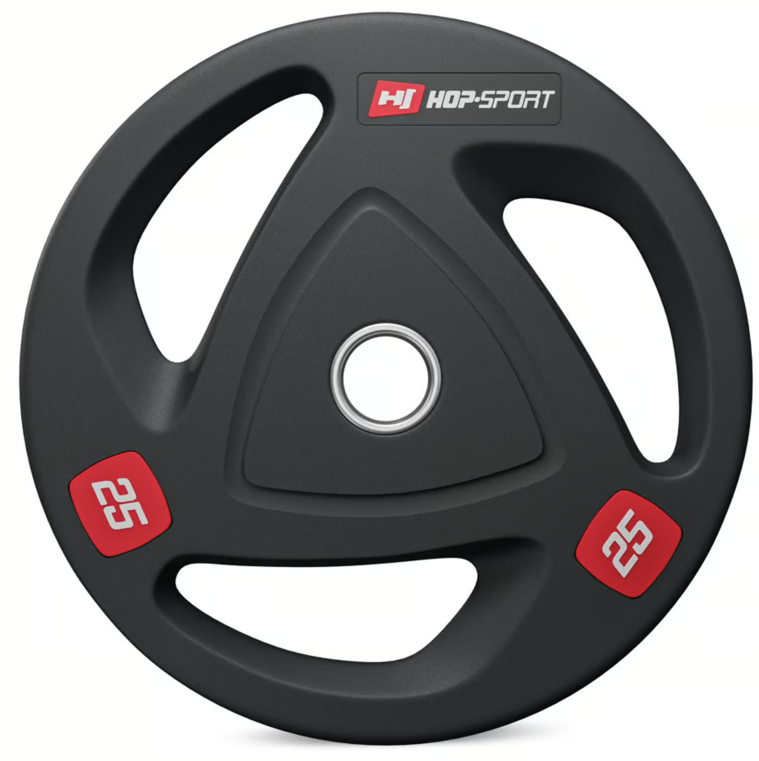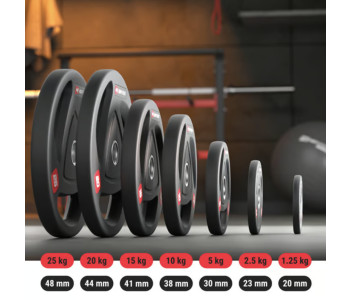 Олімпійські диски 25 кг виготовлені з прецизійного чавуну, покриті антиковзким шаром міцної гуми, яка ефективно амортизує диски при їх падінні і додатково заглушає звуки при падінні. Кільце з нержавіючої сталі в центрі диска з діаметром 51 мм гарантує їм високу міцність і забезпечує точну посадку на штангу. Вага витиснена на дисках, що спрощує їх ідентифікацію, а також спеціальні пази унікальної форми, що виконують роль ручок та підвищують комфорт використання.