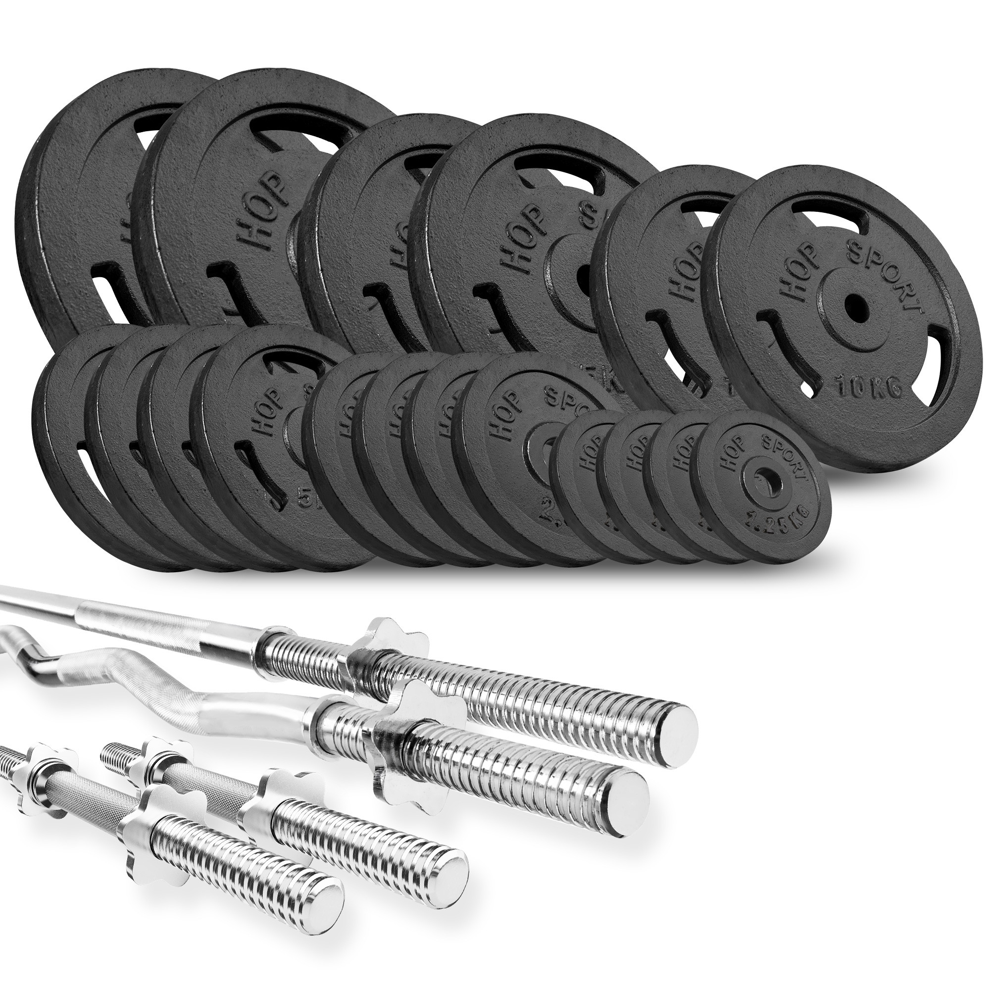 Комплект для бодібілдингу Hop-Sport складається з лавки HS-1065, дисків вагою 125кг, верхньої тяги, прямого, вигнутого і двох гантельних грифів. Всі ці елементи необхідні для виконання силових тренувань вдома. Завдяки силовим тренуванням ви схуднете, поліпшите фігуру, розвинете витривалість, а також поліпшите загальну фізичну форму.