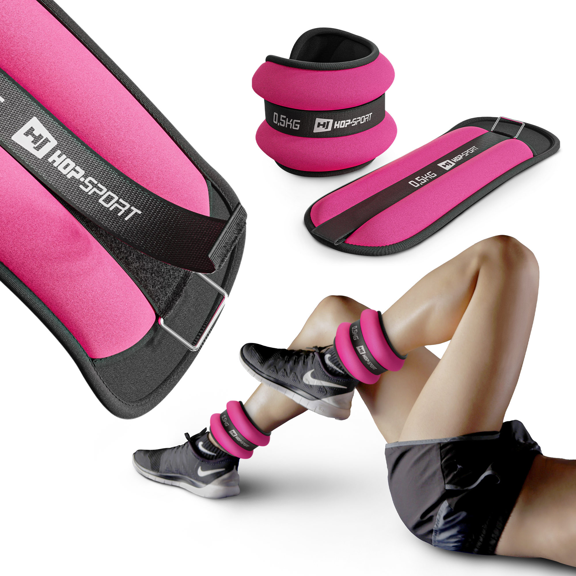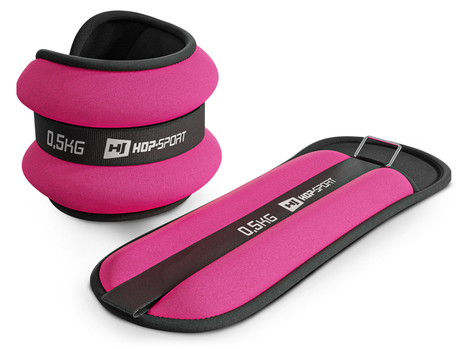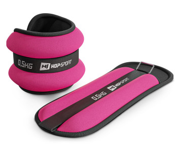 Набір з двох обважнювачів для рук і ніг HS-S001WB, рожевого кольору, по 0,5 кг. Він стане прекрасним доповненням до занять аеробікою. Завдяки цьому набору ви зможете урізноманітнити свої тренування, і задіяти групи м'язів, які не використовуєте щодня. Обважнювачі є неопреновими стрічками, наповненими спеціальним піском. Застібки регулюються за допомогою липучки - ви легко можете відрегулювати ремінець на зап'ясті, передпліччі або литці. Обважнювачі є аксесуарами для так званого легкого фітнесу. Вони допоможуть вам привести себе в форму, відкоригувати фігуру і виробити здорові звички. Завдяки невеликим розмірам їх можна брати з собою куди завгодно.