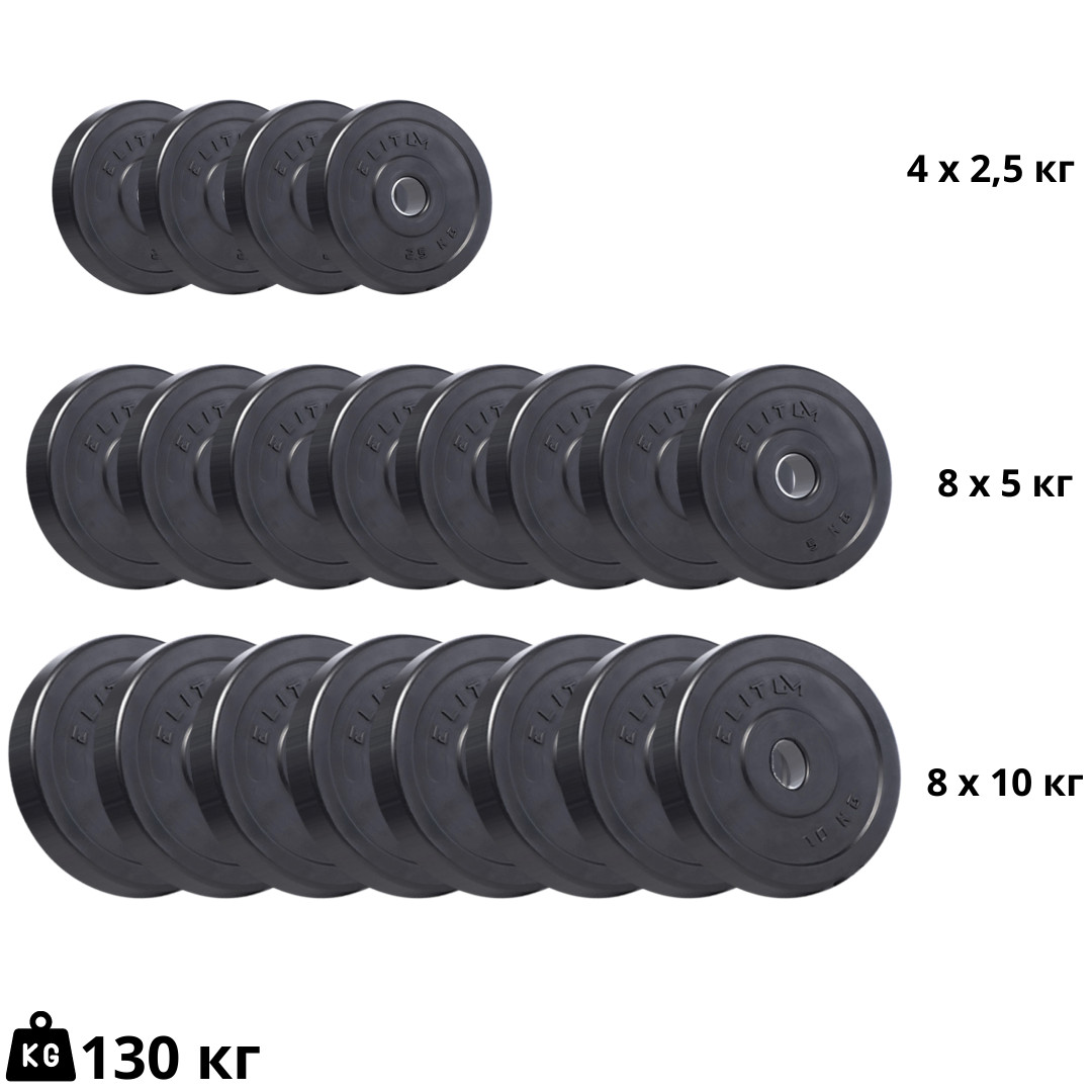 Набір Elitum 130 кг - це універсальний спортивний снаряд для повноцінних силових тренувань в домашніх умовах. Склад набору підібраний з урахуванням рекомендацій професійного тренера, як оптимальне поєднання необхідної ваги та кількості дисків. Набір дозволяє найкращим чином тренувати всі необхідні групи м'язів, і дати їм максимально ефективне навантаження. З набором Elitum ви зможете поліпшити фізичну форму і стан здоров'я, наростити м'язову масу, підвищити витривалість і зміцнити серцево-судинну систему. Набір складається з дисків, покритих ABS-пластиком. Висока якість виготовлення і довговічність деталей гарантує, що ваші тренування з даним набором будуть проходити комфортно, безпечно і з максимальною користю.