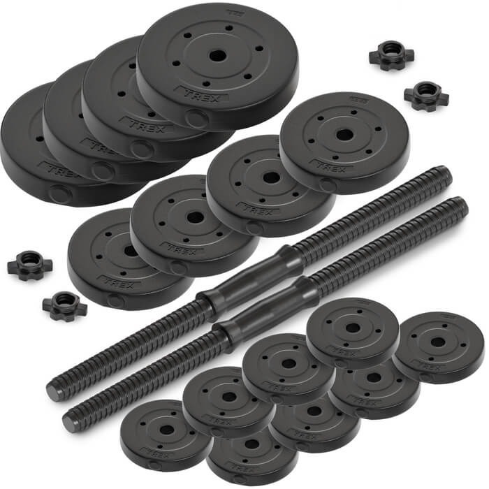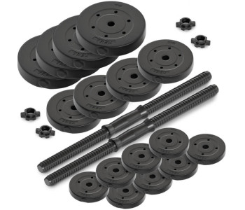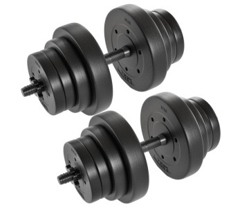 Набір містить цілих 16 дисків, тому ви можете вільно регулювати навантаження, підбираючи вагу гантелі відповідно до своїх потреб і навичок. У комплект також входять прямі металеві грифи, покриті особливим пластиком, та 4 гайки з нарізною різьбою. Гарантія є важливим підтвердженням необхідної якості. Ми впевнені в товарі, який продаємо, тому надаємо гарантію на обладнання 5 років.