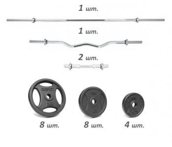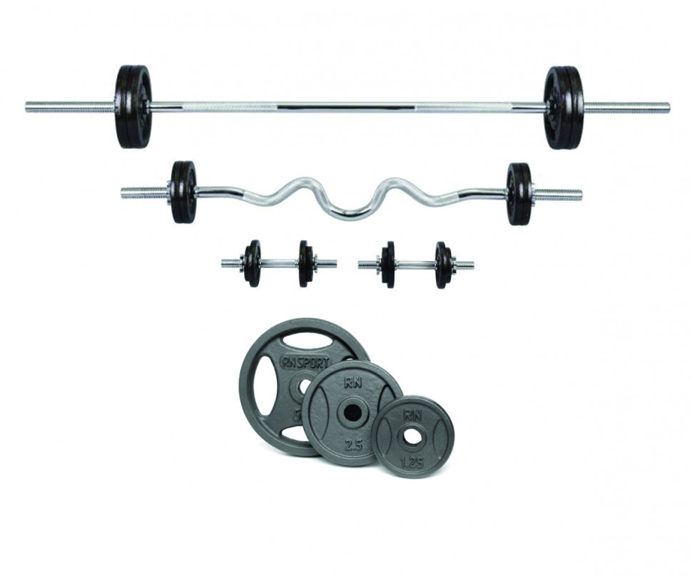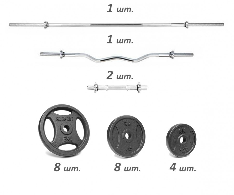 Набір металевих штанг та гантель Quatro-GRIP від RN-Sport. Млинці виготовлені із металу. Після обробки, диски розігрівають у печі до температури 180-200 градусів, забарвлюють міцною фарбою і знову запікають до формування міцної кірки. Завдяки дискам вагою 1.25 кг можна тренуватися з мінімальним кроком ваги. Зручності у використанні додає металеві хромовані грифи з насічкою проти ковзання рук та двома затискними гайками, які мають гумові втулки для щільної та надійної фіксації млинців. За допомогою хвата quatro диски 5 кг можна використовувати як окремий снаряд для різних вправ (підйоми млинця для зміцнення плечей, обертання млинця навколо корпусу для зміцнення м'язів живота (прес і косі м'язи), жим із-за голови для опрацювання трицепса, вправи для передпліч. .. ) Крім вправ, диски служать додатковою вагою для штанги та гантелі. Комплектація: Диск металевий 5 кг х 8шт. Диск металевий 2,5 кг х 8шт. Диск металевий 1,25 кг х 4шт. Гриф для штанги прямий, хромований 150 см, 2 затискні гайки Гриф хромований W-подібний 120 см, 2 затискні гайки Гриф гантельний , хромований 40 см 2 шт, гайки затискні 4 шт 2 а 2 см;2.5 кг - ф 16 см, товщина 2 см, 5 кг - ф22 см, товщина 3 см Діаметр навісної зони грифів 25 мм Діаметр посадкового місця на дисках - 26,5 мм Можна змінити комплектацію згідно Ваших побажань!