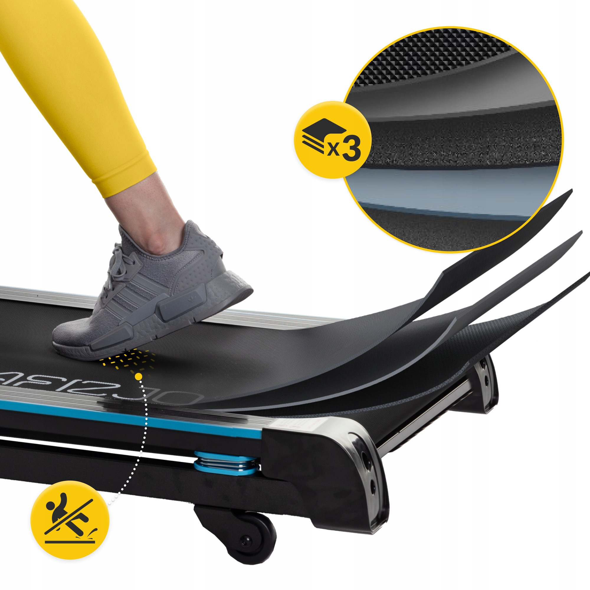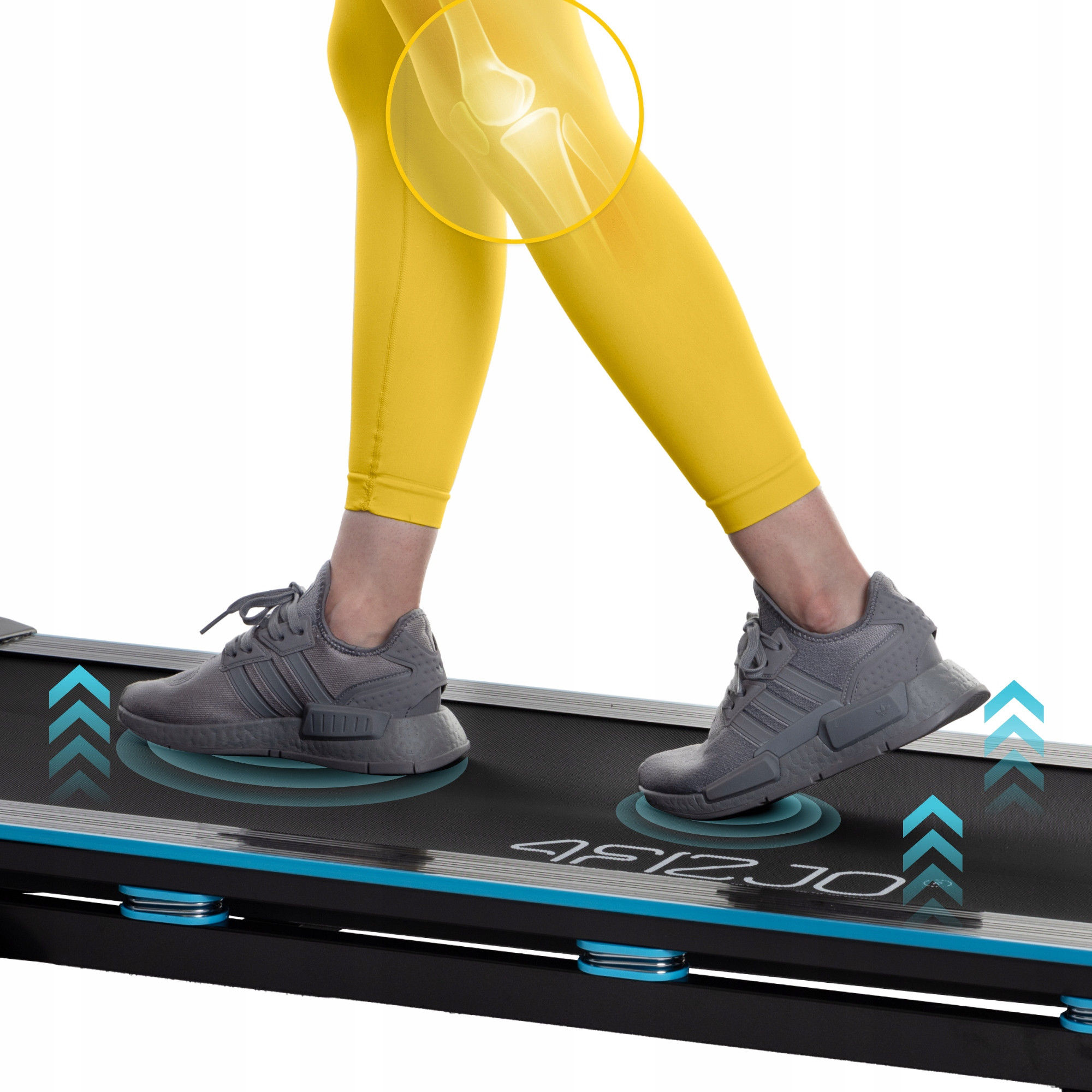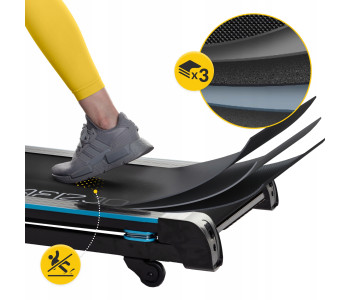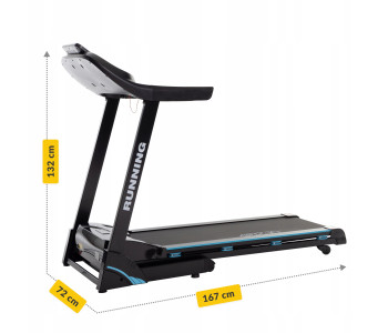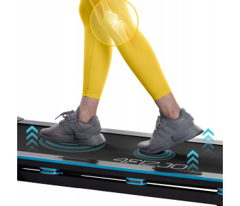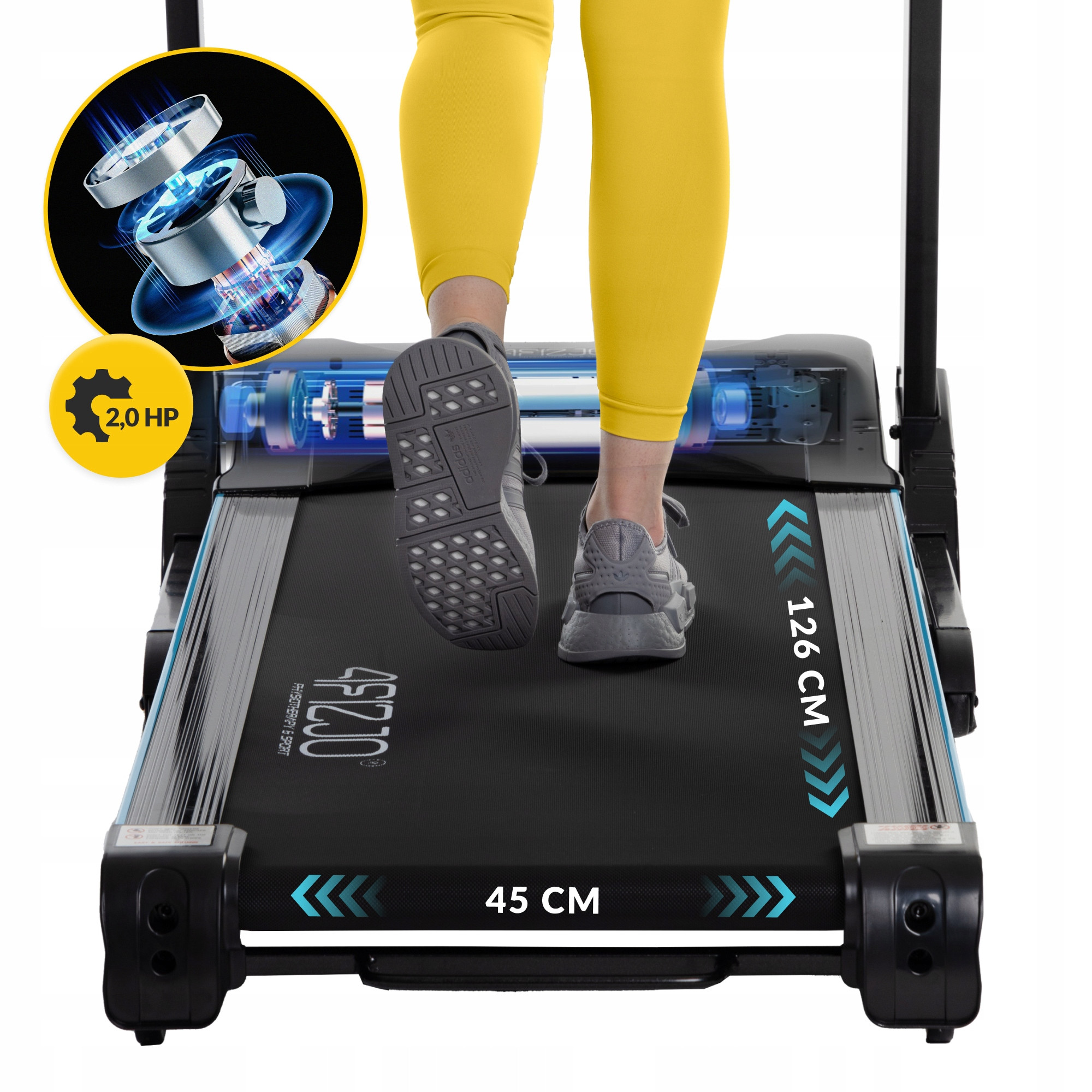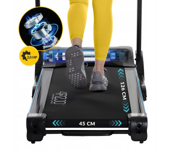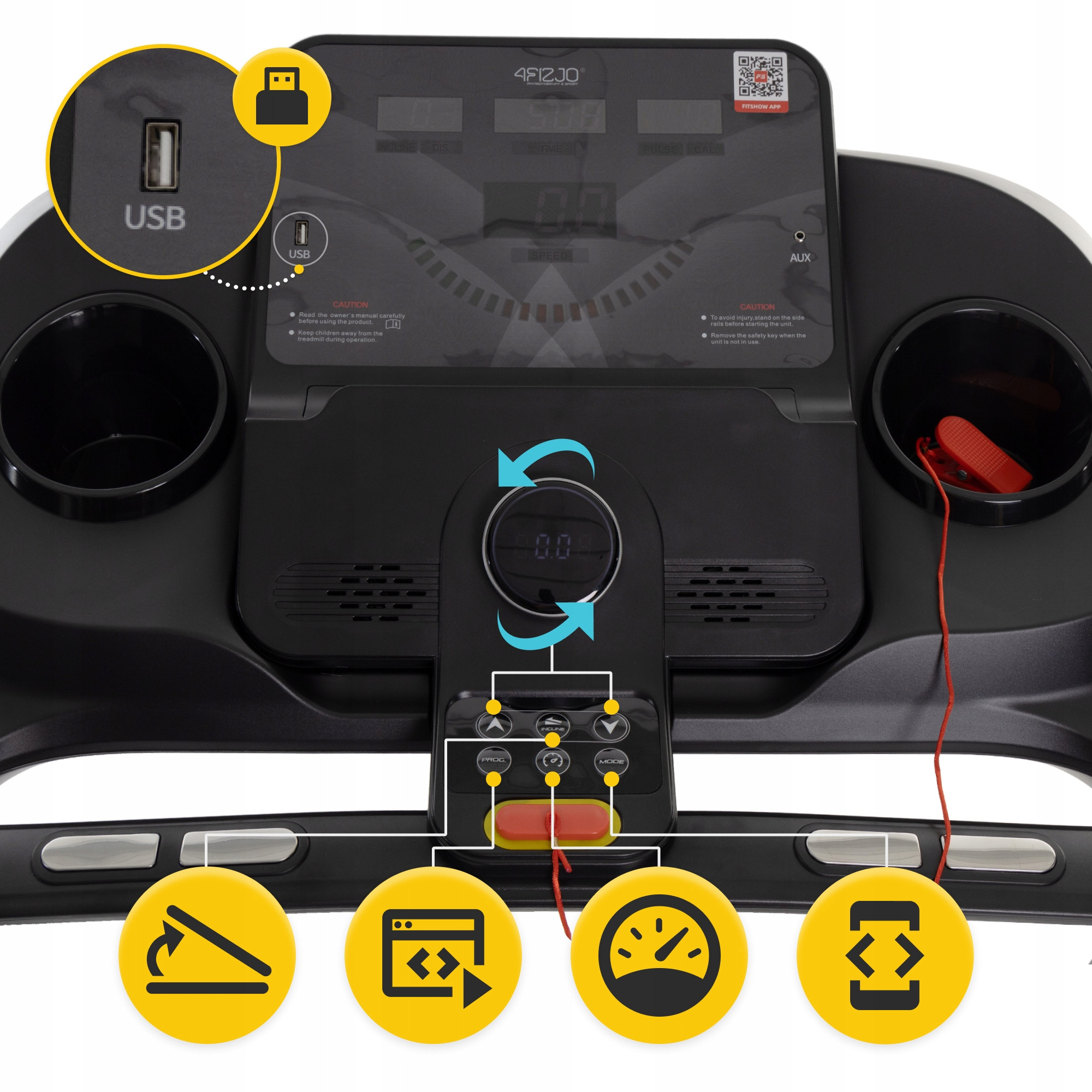 Бігова доріжка від 4FIZJO обладнана надійним двигуном потужністю 2 к.с. з піковим значенням до 3 к.с. Він забезпечує стабільну швидкість руху від 0.8 до 16 км/год під максимальною вагою користувача до 120 кг. Трикомпонентне бігове полотно має некозвку структуру та підвищену стійкість до зношення, його розміри складають 45 x 126 см. Сучасна 8-точкова пружинна система амортизації підвищує безпеку під час бігу та запобігає перевантаженню суглобів і хребта. Кут нахилу полотна бігової доріжки регулюється автоматично на панелі керування у 15 положеннях від 0 до 15%, це допомагає суттєво урізноманітнити та ускладнити тренування.