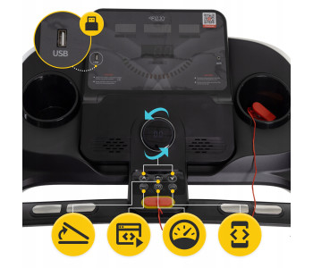 Вбудовані 24 програми не дадуть занудьгувати навіть вимогливим користувачам. Ефективність тренувань зазвичай вимірюється кількістю пройдених кілометрів, витраченими калоріями чи тривалістю активності. Ви знайдете всю цю інформацію на панелі керування бігової доріжки. Все, що вам потрібно зробити, це ввести свої параметри (стать, вік, зріст, вага) перед початком занять. Далі ви тренуєтеся, а консоль виконує всі розрахунки за вас. Ось так виглядає ефективна автоматизація у спорті. В розпорядженні користувача й інші приємні функції: вбудовані динаміки, bluetooth, клавіші швидкого доступу, місце для пляшки з водою, підставка для телефона/планшета, вхід для навушників, USB вхід, сумісність з мобільними додатками та інше.