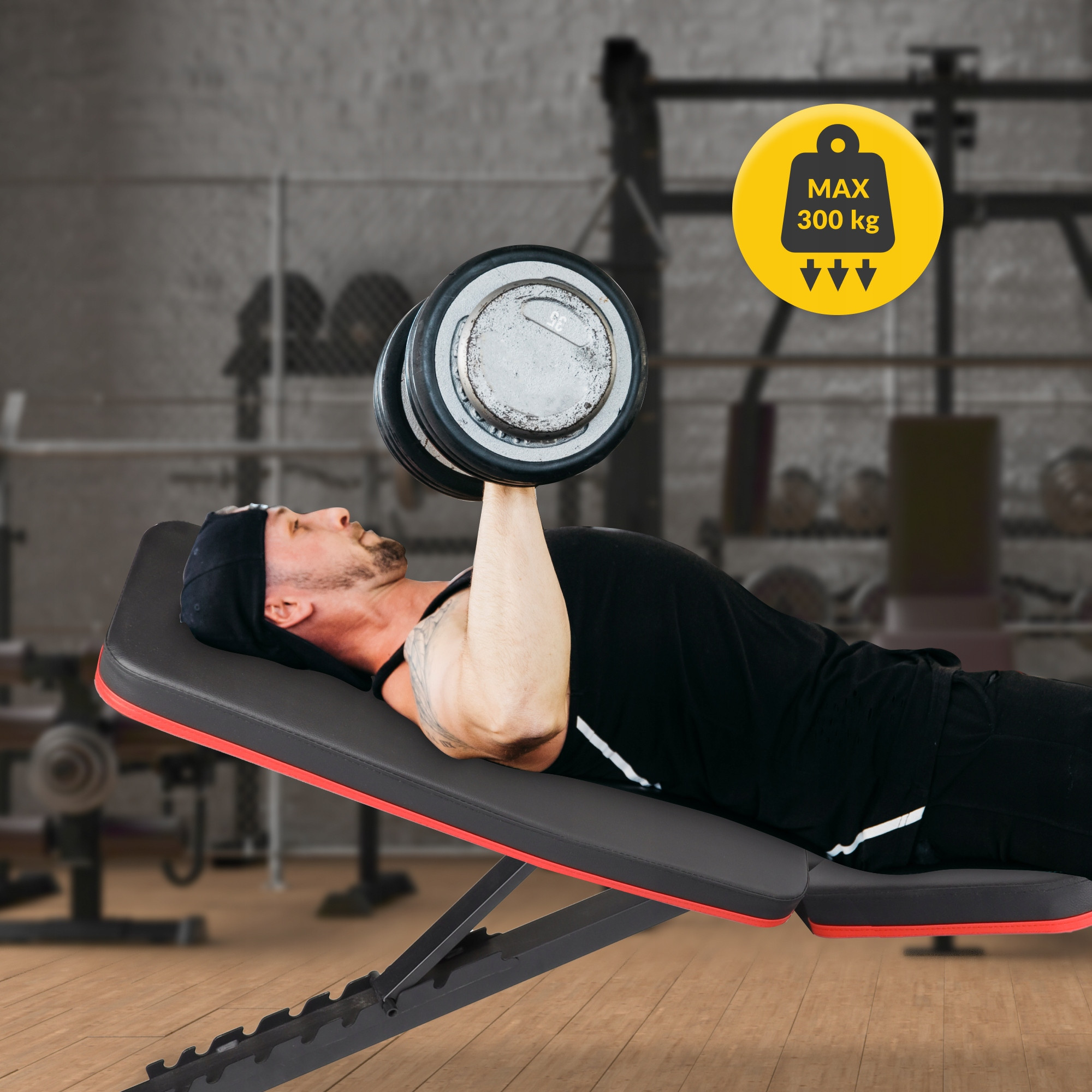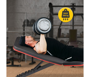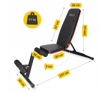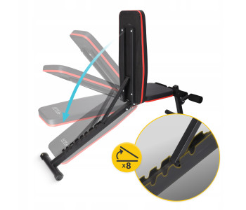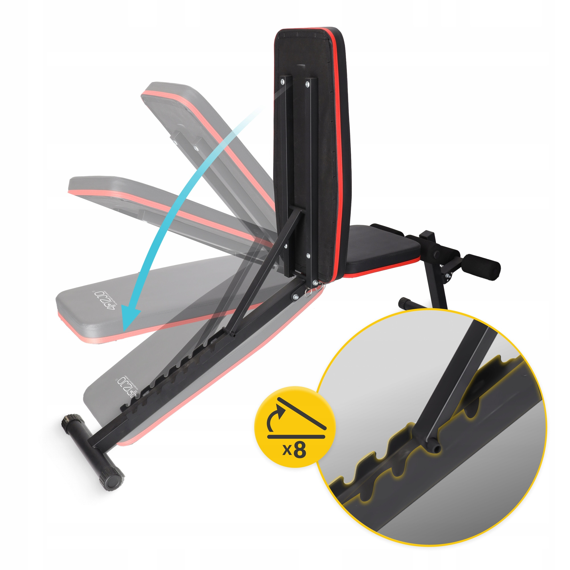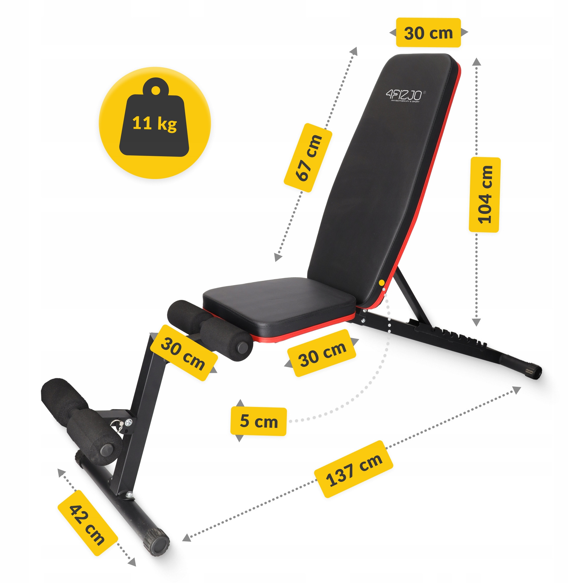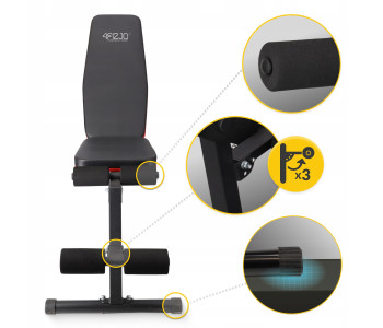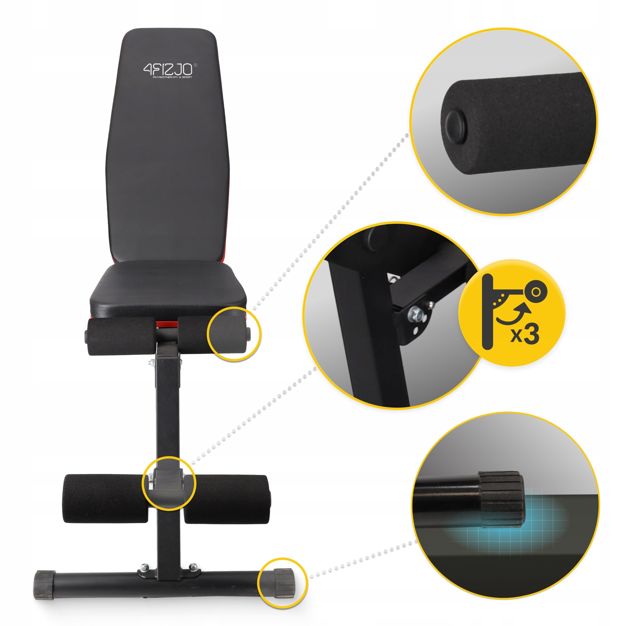 Рама багатофункціональної лави для тренувань від 4FIZJO виконана з високоякісного сталевого профілю, тому максимальне навантаження на неї становить до 300 кг. Тренажер оснащений різноманітними системами зміни кута нахилу, завдяки яким спинку можна відрегулювати у 8-ми положеннях, а валик для ніг у 3-ох. Якісна та приємна на дотик оббивка з екошкіри наповнена стійкою до деформації, м'якою піною, що гарантує комфорт використання. Гумові ніжки з антиковзкою структурою забезпечать хорошу стійкість інвентарю. Ще однією перевагою даної тренувальної лави є можливість складання. Закінчивши тренування ви можете з легкістю сховати її в зручному місці, наприклад, під ліжком або за шафою.