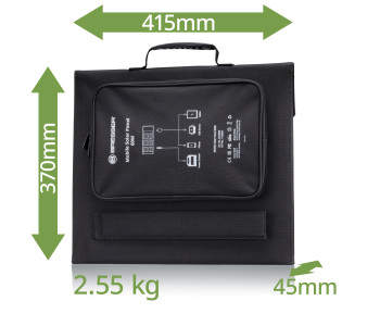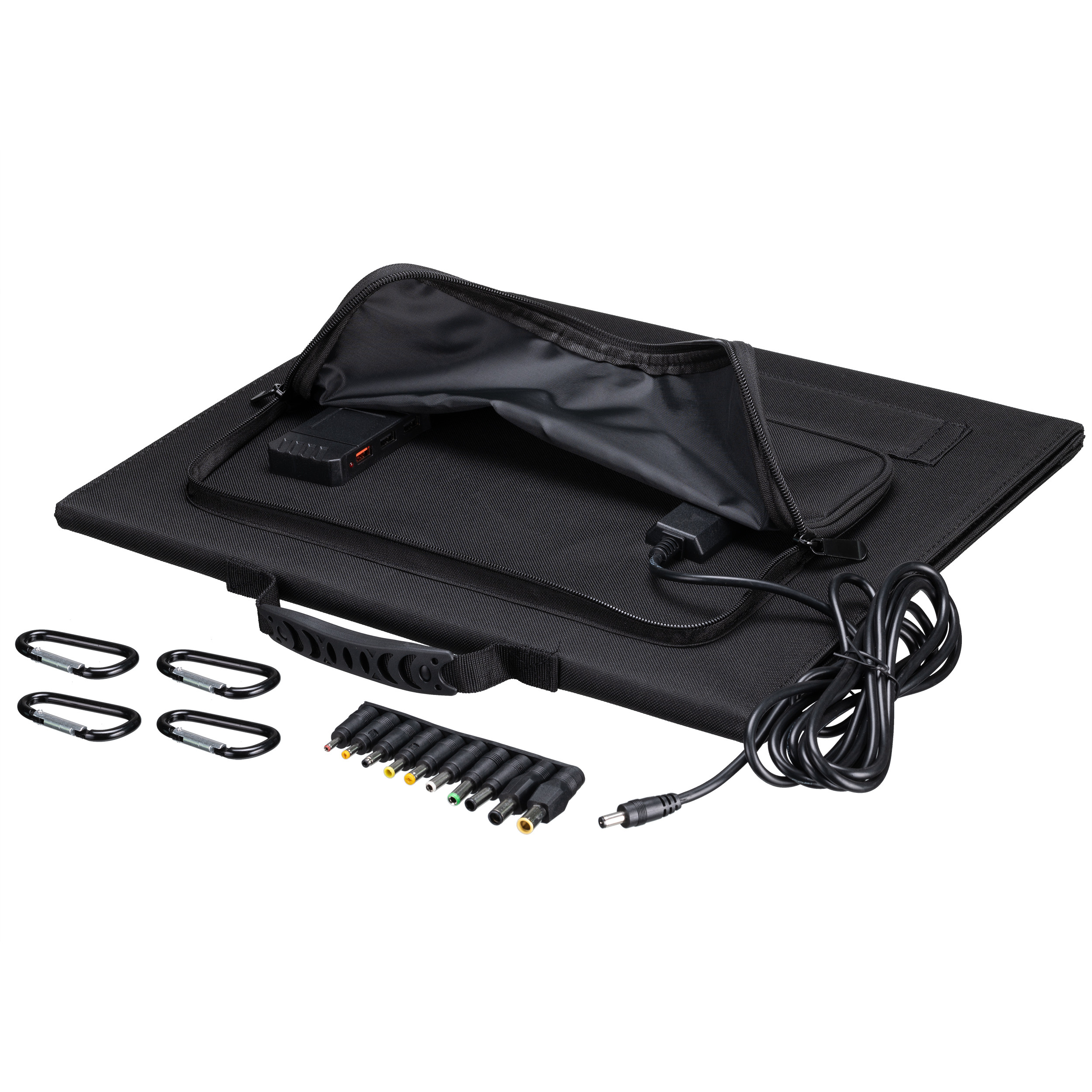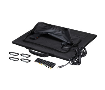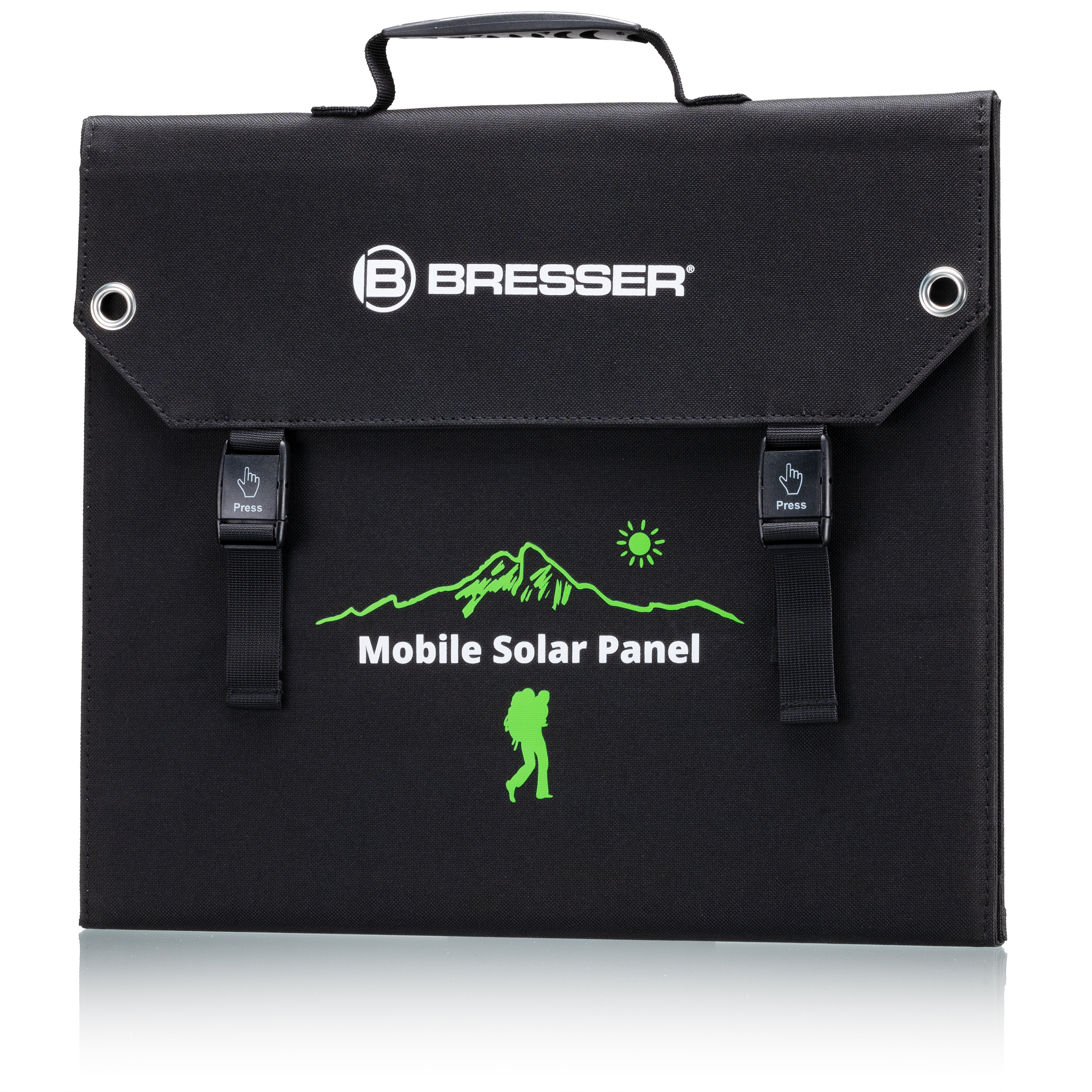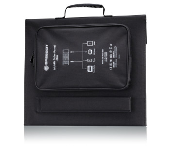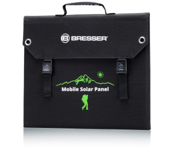 Портативний сонячний зарядний пристрій Bresser Mobile Solar Charger 60 Watt призначений швидко заряджати смартфони, планшети, ноутбуки та зовнішні акумуляторні батареї. Інноваційна технологія сонячних батарей, на основі монокристалічних кремнієвих елементів, забезпечує високу ефективність та максимально швидку зарядку різних акумуляторів. Міцна та надійна тканина Cordura захищає сонячну панель від механічних пошкоджень та забезпечує необхідну стабільність під час використання. Сонячна панель має додатковий захист завдяки застосуванню при виготовленні пило- та водовідштовхувальних матеріалів, але не розрахована на використання під проливним дощем або зануренню безпосередньо у воду. Для надійної фіксації панелі до об'єкту (палатка, автомобіль, рюкзак, дерево), в комплект поставки входять 4 міцні карабіни.