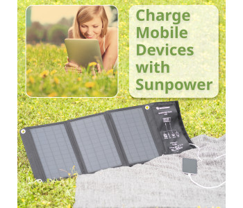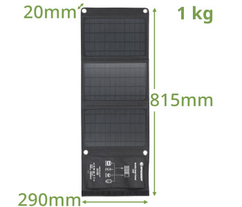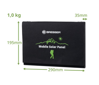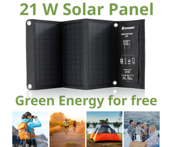 Портативний сонячний зарядний пристрій Bresser Mobile Solar Charger 21 Watt призначений швидко заряджати смартфони, планшети, павербанки. Інноваційна технологія сонячних батарей, на основі монокристалічних кремнієвих елементів, забезпечує високу ефективність та максимально швидку зарядку різних акумуляторів. Міцна та надійна тканина Cordura захищає сонячну панель від механічних пошкоджень та забезпечує необхідну стабільність під час використання. Сонячна панель має додатковий захист завдяки застосуванню при виготовленні пило- та водовідштовхувальних матеріалів, але не розрахована на використання під проливним дощем або зануренню безпосередньо у воду. Для надійної фіксації панелі до об'єкту (палатка, автомобіль, рюкзак, дерево), в комплект поставки входять 2 міцні карабіни.
