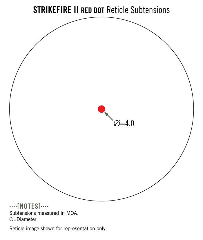 Оновлена модель прицілу StrikeFire II тепер зі збільшеним терміном роботи батареї до 80000 годин (на середній яскравості 6). Коліматор ударостійкий, його алюмінієвий корпус виготовлений із цільної заготовки. Колір прицільної точки червоний, також за допомогою 10-позиційного реостата регулюється яскравість. Повне багатошарове просвітлення підвищує світлопропускання лінз. На всі зовнішні поверхні лінз нанесено противідблискове покриття. Приціл відбудовано від паралакса на дистанцію 45 м, на дистанціях, менш ніж 45 м, помилка становить 2,5 см.