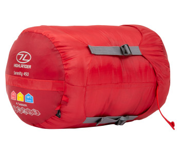 Highlander Serenity 450/-10°C Red Left (SB187-RD) - чотирисезонний спальний мішок у класичному стилі, який чудово зберігає тепло Вашого тіла. Його вузька форма підійде всім, хто шукає додаткового тепла холодними ночами, а регульований капюшон робить його затишним і комфортним. Міцна зовнішня оболонка наповнена синтетичним утеплювачем, який зберігає тепло, навіть коли стає мокрим, тому конденсат більше ніколи не заважатиме Вам спати. М’яка внутрішня підкладка та сучасний синтетичний наповнювач гарно зберігають тепло. Ви можете взяти спальний мішок Highlander Serenity 450/-10°C Red Left (SB187-RD) куди завгодно, оскільки він щільно упаковується в невеликий компресійний чохол. Спальник можна покласти в туристичний рюкзак, дорожню сумку або багажник автомобіля.