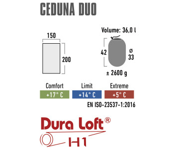 High Peak Ceduna Duo/+14°C Blue/Dark Blue Twin (20031) - двомісний спальний мішок прямокутної форми із чохлом у комплекті. М'яка зовнішня оболонка не містить PFC-з'єднань, має водо- та брудовідштовхувальне просочення, виконане за екологічно чистою технологією Bionic-Finish® Eco. Внутрішня підкладка спальника дихаюча і приємна для шкіри. Спальний мішок має високоякісний синтетичний наповнювач Dura Loft® H1 із чудовими теплоізоляційними характеристиками. Даний матеріал легко стискається, довговічний, зберігає тепло навіть у вологих умовах і швидко висихає. Двостороння L-подібна блискавка по обидва боки дозволяє самостійно входити-виходити, не заважаючи партнеру. Повністю розстебнута блискавка перетворює спальний мішок на дві ковдри розміром 200 x 150 см. Застібка блискавки має ергономічну форму для зручного хвату рукою. Дві внутрішні кишені із застібками на липучці забезпечують зручне зберігання цінних речей. Спальний мішок розрахований на зріст користувачів до 190 см, призначений для туристичних походів та відвідування фестивалів. Рекомендується прати у пральній машині при температурі 30°C.