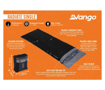 Vango Radiate Single/-3°C Black Left (SBQRADIATB05TJ8) - інноваційний спальний мішок з підігрівом, обов’язково зігріє Вас під час сну під зірками. Дана модель має вбудований графеновий нагрівальний елемент, що дозволяє Вам контролювати тепло в спальному мішку при підключенні до джерела живлення. Спальний мішок сумісний із багатьма павербанками, він також додасть нотку розкоші Вашому відпочинку в кемпінгу завдяки високоякісній тканині, наповнювачу і вбудованому підголівнику. Спальний мішок Vango Radiate Single/-3°C Black Left (SBQRADIATB05TJ8) розрахований на зріст до 190 см, призначений для використання з початку весни до кінця осені. Вам позаздрять інші туристи.