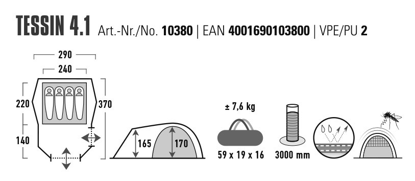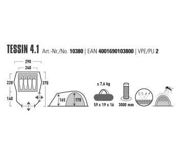 High Peak Tessin 4.1 Deep Forest (10380) - чотиримісний купольний намет із просторим тунельним тамбуром і додатковим бічним входом. Модель має алюмінізоване покриття зовнішнього тенту, яке зміцнює тканину та знижує підвищення температури всередині в сонячну погоду. Намет оснащений екологічно чистим водовідштовхувальним DWR-просоченням без PFC елементів. Дві високоефективні системи вентиляції Advanced Low Vent System забезпечують оптимальну циркуляцію повітря навіть у дощові дні. Достатня відстань між внутрішнім наметом і зовнішнім тентом суттєво зменшує утворення конденсату. Затемнена спальня не пропускає яскраве світло, дозволяючи виспатися всім, хто пізно прокидається. Система вентиляції внутрішнього намету Vario Vent Control забезпечує регульований потік свіжого повітря, щоб ви могли виспатися ще краще. Всі шви дна і тенту проклеєні спеціальною стрічкою, гарантуючи захист від проникнення вологи в дощову погоду. В наметі зможуть без проблем розміститися три-чотири людини з усім спорядженням. Намет чотиримісний High Peak Tessin 4.1 Deep Forest (10380) стане чудовим вибором для комфортного сімейного відпочинку протягом вихідних.
