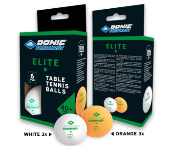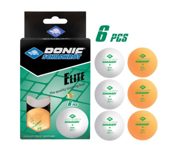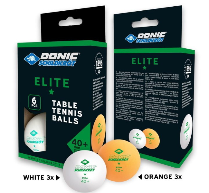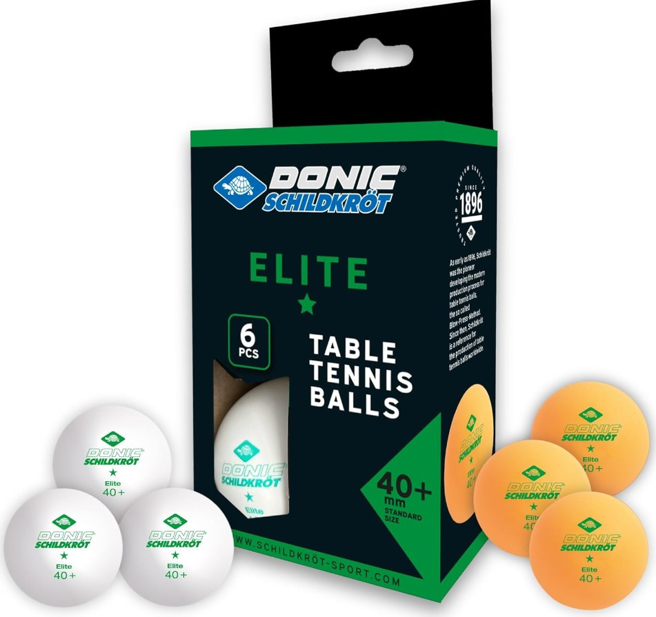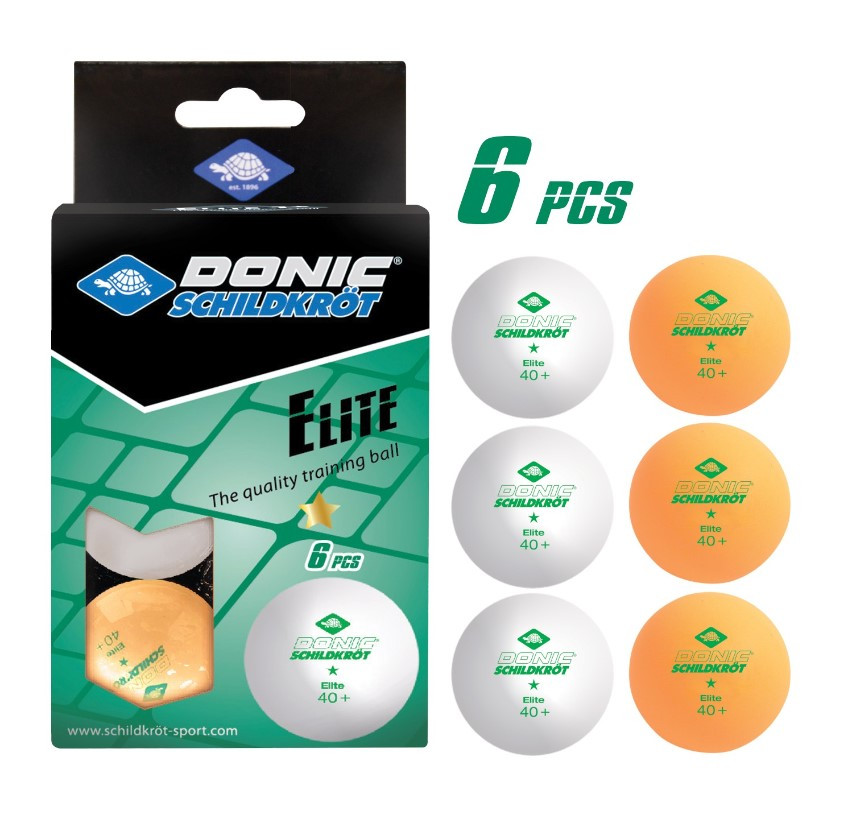 М'ячі Donic -Schildkröt Elite Poly, 1 Star для пінг-понгу виготовлені з дуже міцного пластику для найбільш досвідчених гравців-любителів і для тренувань. Пластикові м’ячі пропонують таку саму зручність гри, але вони набагато екологічніші у виробництві, ніж целулоїдні м’ячі. Зазвичай вони відрізняються від целулоїдних м'ячів печаткою «40+».