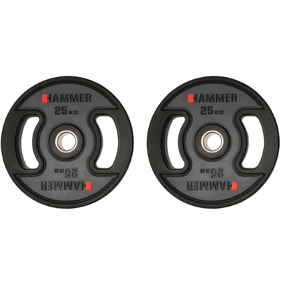 Олімпійські диски професійні Hammer PU Weight Discs 2*25 kg 4711 з поліуретановим покриттям та зручними вирізами для рук. Внутрішній діаметр – 50 мм, матеріал – чавун. Ідеально підходять для силових тренувань як у домашньому спортзалі, так і у фітнес клубі.