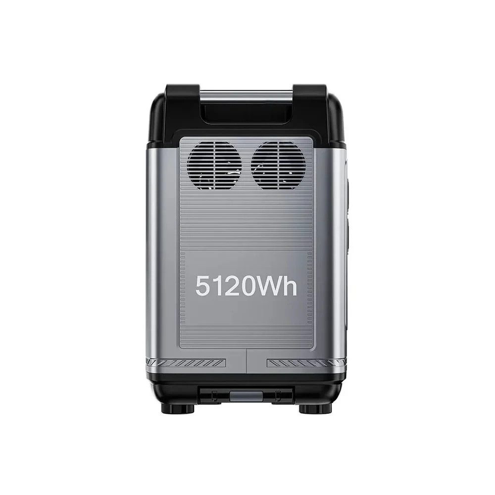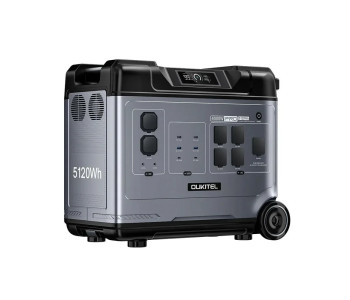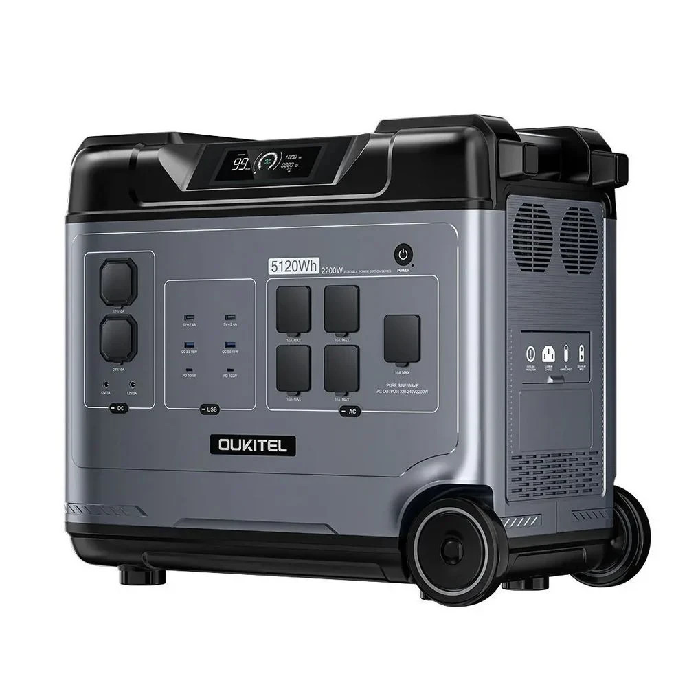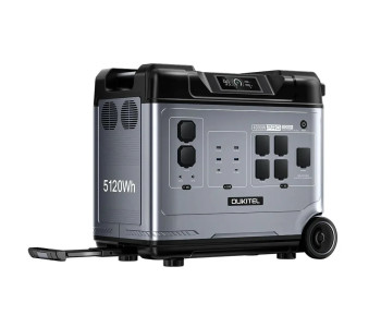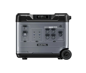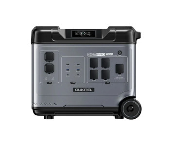 Портативна зарядна станція OUKITEL P5000E Pro з функцією ДБЖ, з номінальною потужністю 4000 Вт, піковою потужністю 8000 Вт, вихідна напруга 200-240 В, чиста синусоїда. Вбудована акумуляторна батарея LiFePO4 потужністю 5120 Втг (51.2В/100Аг). Зарядна станція може одночасно заряджати до 15 пристроїв (завдяки вбудованим вихідним портам). Можливість заряджання станції від електромережі (вбудований зарядний пристрій 1800 Вт), від сонячних панелей максимальною потужністю 1000 Вт (слід придбати окремо), від прикурювача (зарядний кабель у комплекті) та від PD-адаптера живлення (купується окремо). Час заряду від електромережі до 80% заряду – 1 година 30 хвилин, до 100% заряду – 2 години 10 хвилин.