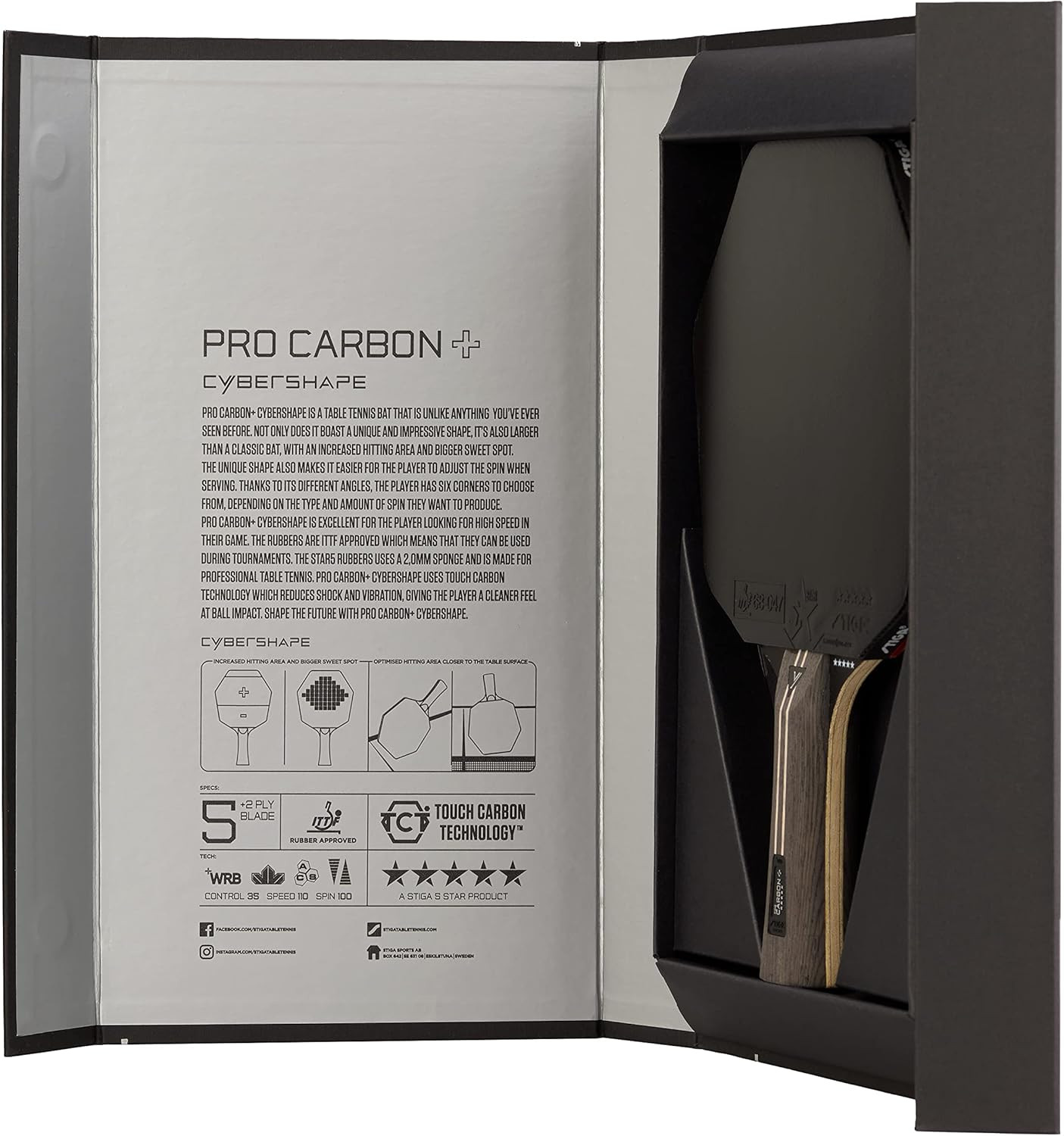 Наші дослідження показують, що для більшості гравців оптимальна область удару знаходиться у верхній половині леза. Ось чому ми хотіли створити зручну у грі ракетку, яка також виведе вашу гру на новий рівень. Cybershape пропонує велику ударну поверхню у верхній частині леза та зменшену ударну поверхню на нижньому лезі. Це означає, що лезо не надто важке, тим самим пропонуючи ідеальний баланс разом із ідеальною точкою найкращого удару. З Cybershape 5-star ми кидаємо виклик обмеженням технології настільного тенісу, щоб запропонувати вам щось нове. Розроблена для змагань ракетка STIGA Carbon Plus включає технологію ACS, що включає надлегку гуму з мікроскопічними повітряними капсулами, які забезпечують неймовірну швидкість, еластичність і точний контроль. Завдяки технології Crystal від STIGA основа ракетки загартована для підвищення швидкості, а технологія WRB покращує баланс леза, швидкість відновлення та чутливість м’яча. Ракетка має лезо з карбоновими волокнами та може похвалитися винятковими показниками швидкості та обертання м'яча. Підніміть свою гру на нові висоти!