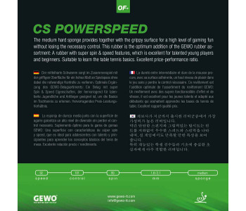 Накладка: губка 1,8 мм, гума GEWO Powerspeed це гума абсолютної потужності, яка націлена на потужність і швидкість. Еластична та липка гумова поверхня дозволяє здійснювати швидкі топспіни з великим обертанням і швидкістю. Ви будете в повному захваті!