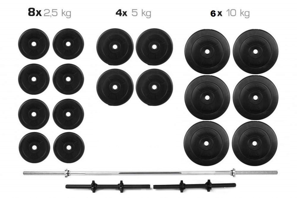 Представляем набор нагрузок (Штанга + Гантели) с общим весом 110 кг. С помощью данного набора Вы сможете полноценно заниматься со штангой и гантелями как и в спортзале так и в домашних условиях. Диски подходят к прямому грифу, w-образному и к гантельным грифам поэтому набор считается универсальным. Вы сможете чередовать занятия со штангой и гантелями, тем самым равномерно прорабатывать различные группы мышц.