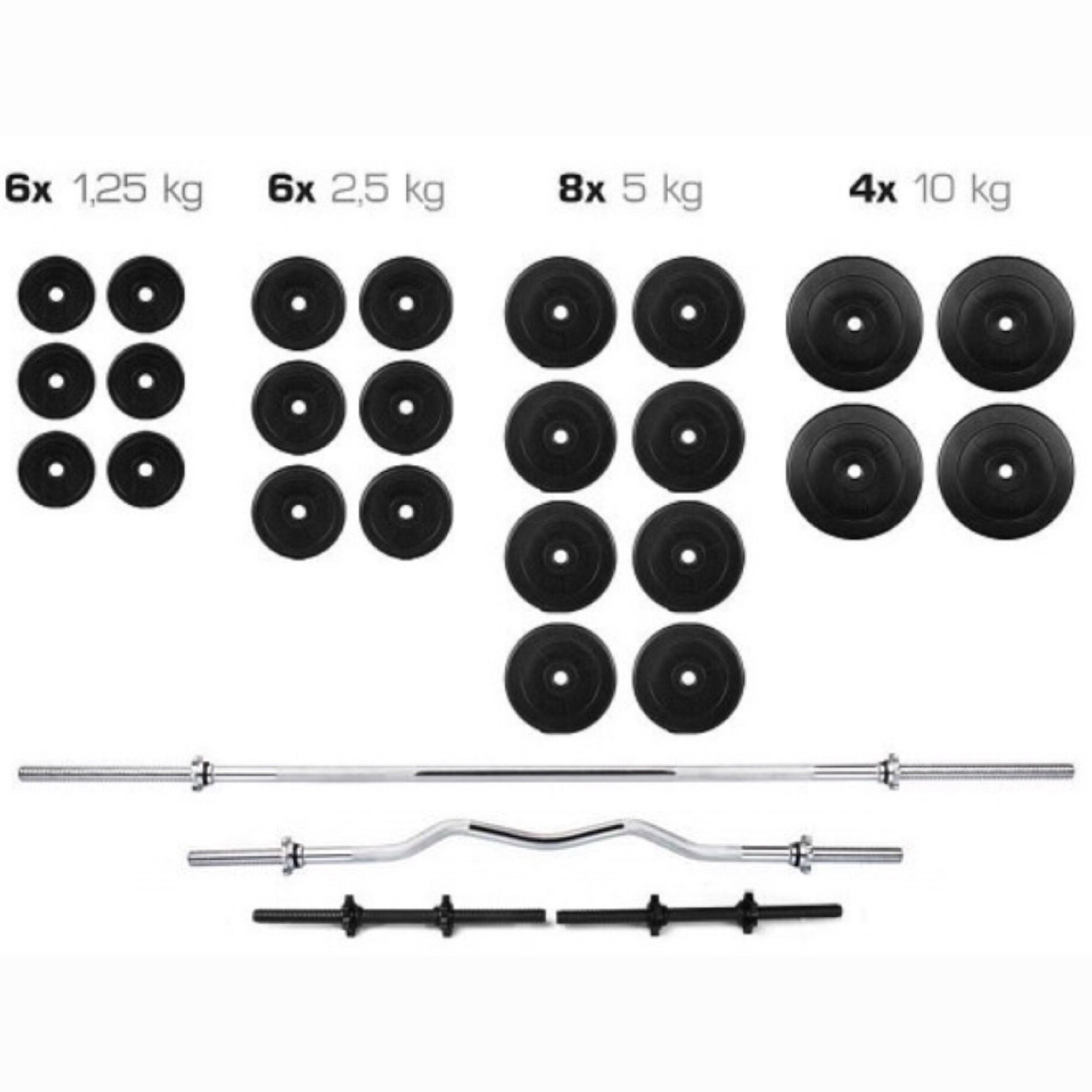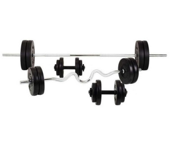 Представляємо набір навантажень (Штанга + Гантелі) з загальною вагою 128 кг. За допомогою цього набору Ви зможете повноцінно займатися зі штангою і гантелями як і в спортзалі так і в домашніх умовах. Диски підходять до прямого грифу, w-подібного і до гантельних грифів тому набір вважається універсальним. Ви зможете чергувати заняття зі штангою і гантелями, тим самим рівномірно опрацьовувати різні групи м'язів.