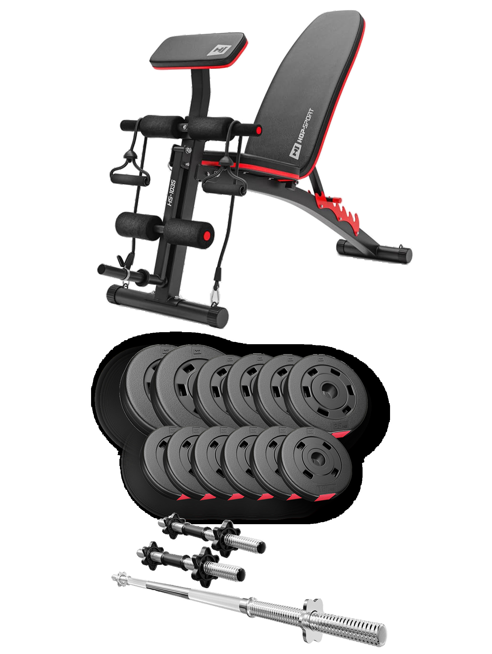 Набір Premium 38кг зі штангою і лавою HS-1035 - ідеально підібраний комплект з функціональною лавкою і найкращим поєднанням кількості і ваги дисків, щоб організувати вдома повноцінний спортзал для силових тренувань.