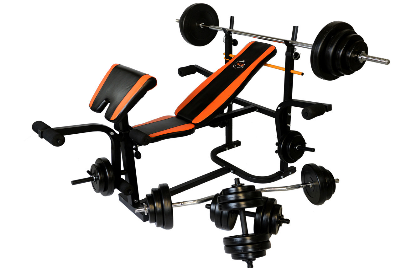 Лавка Для Жима універсальна WCG 0020 з Тягою та партою Скотта + Набір штанга та гантелі на 148 кг