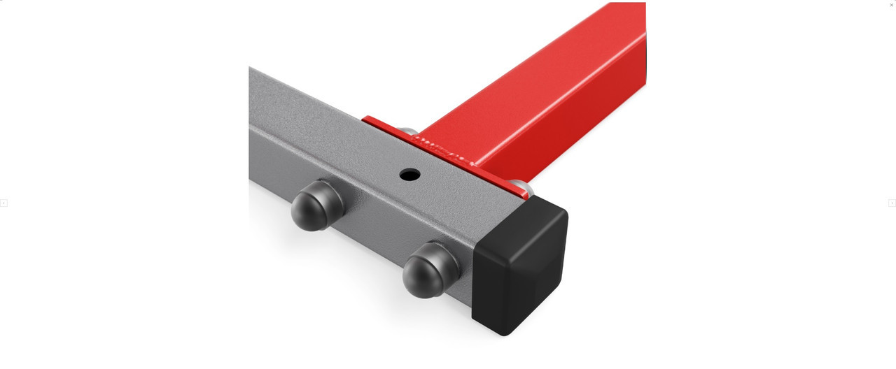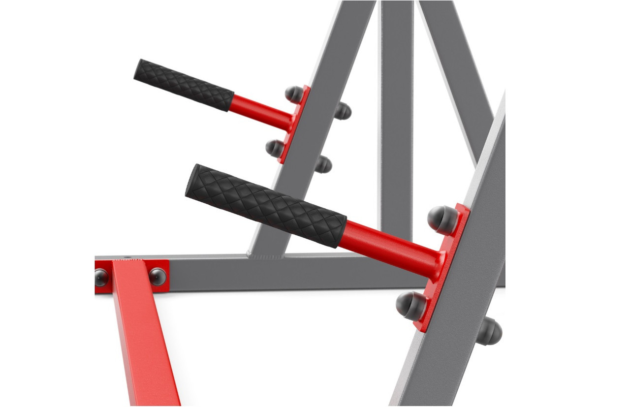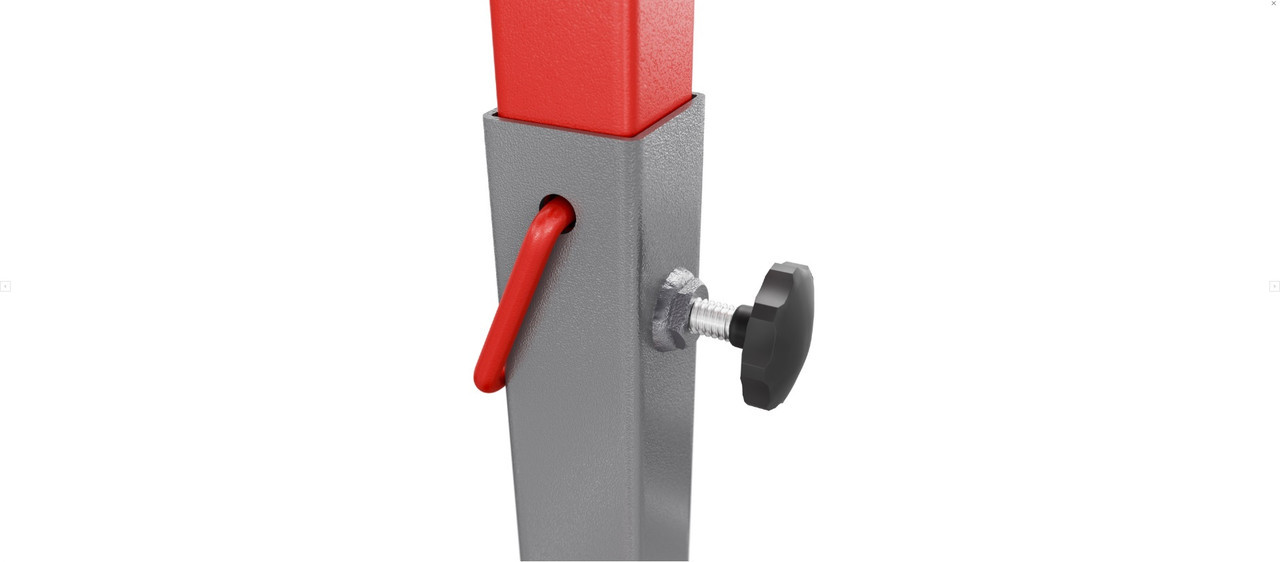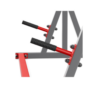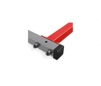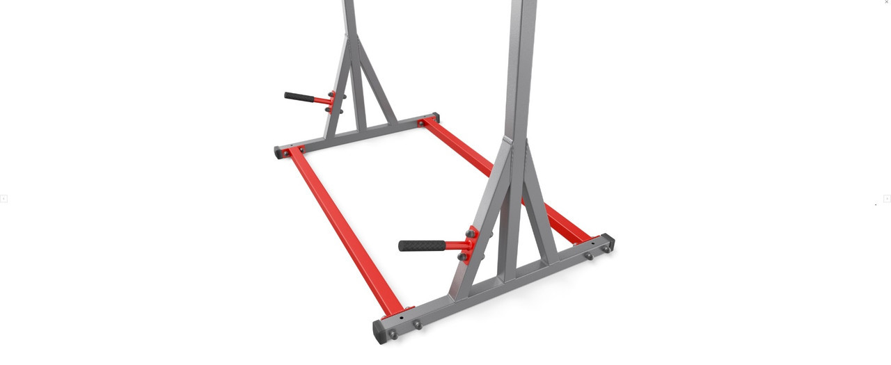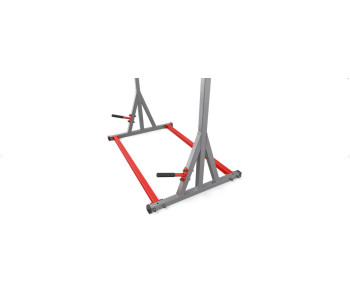 Підстава стрижня є міцною і масивною рамою, з'єднаною двома поперечними профілями. Відстань між вертикальними профілями та шириною стрижневої трубки становить 120 см, що створює оптимальний простір для багатьох видів вправ. Ретельно виготовлені зварні шви та опорні профілі запобігають передачі вібрації та стабілізують стрижень. Елементи яскраво-червоного кольору надають сучасному вигляду пристрою, що важливо при виборі обладнання для домашнього або комерційного тренажерного залу.
