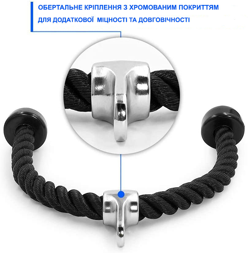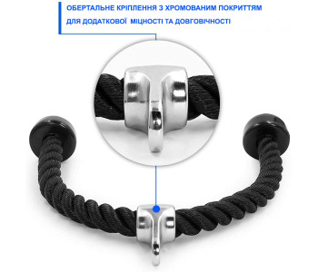 Аксесуар є потужним тросом, технологія плетіння якого виключає його розтріпування з плином часу. Для його виготовлення використовується нейлон – міцний, стійкий до деформації та впливу вологи матеріал. До троса тренажера канат кріпиться за допомогою широкого сталевого кільця з петлею. Воно вільно обертається на канаті та впливає на динаміку вправи.