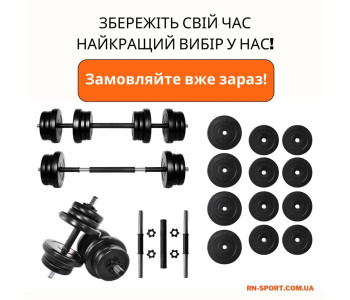 Гантелі з функцією штанги 2в1 на 52 кг від RN-Sport включають дві гантелі по 26 кг + перехідник для функції штанги. Достатньо скрутити гантельні грифи у перехідник, щоб отримати набірну штангу вагою від 2.5 кг до 52 кг. Різна вага навантажень дозволить вам контролювати інтенсивність тренувань та адаптувати її під свої вправи. Особливо це корисно для людей із різним ступенем підготовки. Як тих, хто на початковому етапі, так більш досвідчених. Весь набір дуже компактний, і після тренування його легко можна сховати куди завгодно. У наш комплект регульованих гантелі з загальною вагою 52 кг 8 дисків по 5 кг 4 диски по 2,5 кг 2 короткі грифи 45 см 1 перехідник довгою 32 см 4 гайки для затискача дисків робити вправи можна як із гантелями так і зі штангою Гантелі з функцією штанги 2в1 від RN-Sport дозволяють виконувати вправу на все тіло! Основні вправи: жим лежачи, станова тяга, присідання, тяга в нахилі, підйом на біцепс, французький жим на трицепс, жим з-за голови, шраги для трапецій, згинання для передпліч, розведення, махи ... Продукція RN-Sport пройшла сертифікацію СЕС. Гігієнічний сертифікат (висновок санітарно-епідеміологічної експертизи, санітарно-епідеміологічний висновок) - документ, що підтверджує відповідність медичним вимогам безпеки для здоров'я та життя людини. Не витрачайте час, замовляйте вже сьогодні! Особливості товару Диски мають округлу форму Вказано вагу на кожному млинці Повністю покритий протиударним пластиком з усіх боків Пластик захищає будь-яке покриття від сколів, тріщин, подряпин. Не дзвеніть під час заняття та одягання млинців на гриф Отвори дисків зміцнені від стирання Доставляються у посиленій упаковці Гарантія на виріб – 5 років Характеристики товару Вид замку: Гвинтовий Форма грифа: Пряма Діаметр грифа: 30 мм Довжина: 45 см У комплекті: два грифи, чотири гайки + перехідник для нудьгування грифів під штангу Максимальне навантаження: 60 кг Млинці вкриті протиударним пластиком Вага дисків: 8 по 5 г, 4 по 2.5 кг Загальна вага набору: 52 кг Колір дисків: Чорний Сертифікована продукція RN Sport. № укладання СЕС 12.2-18-2/20550