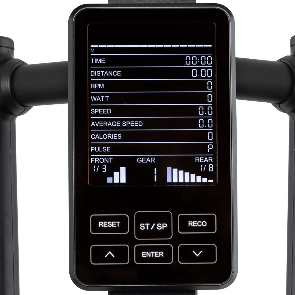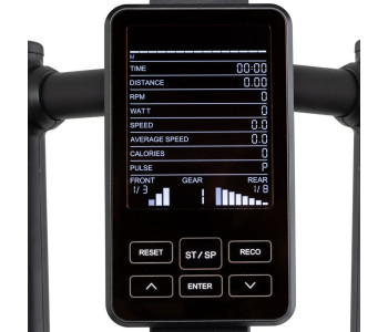 - Комп'ютер відображає: час, швидкість, середню швидкість, відстань, калорії, оберти за хвилину, пульс, вати