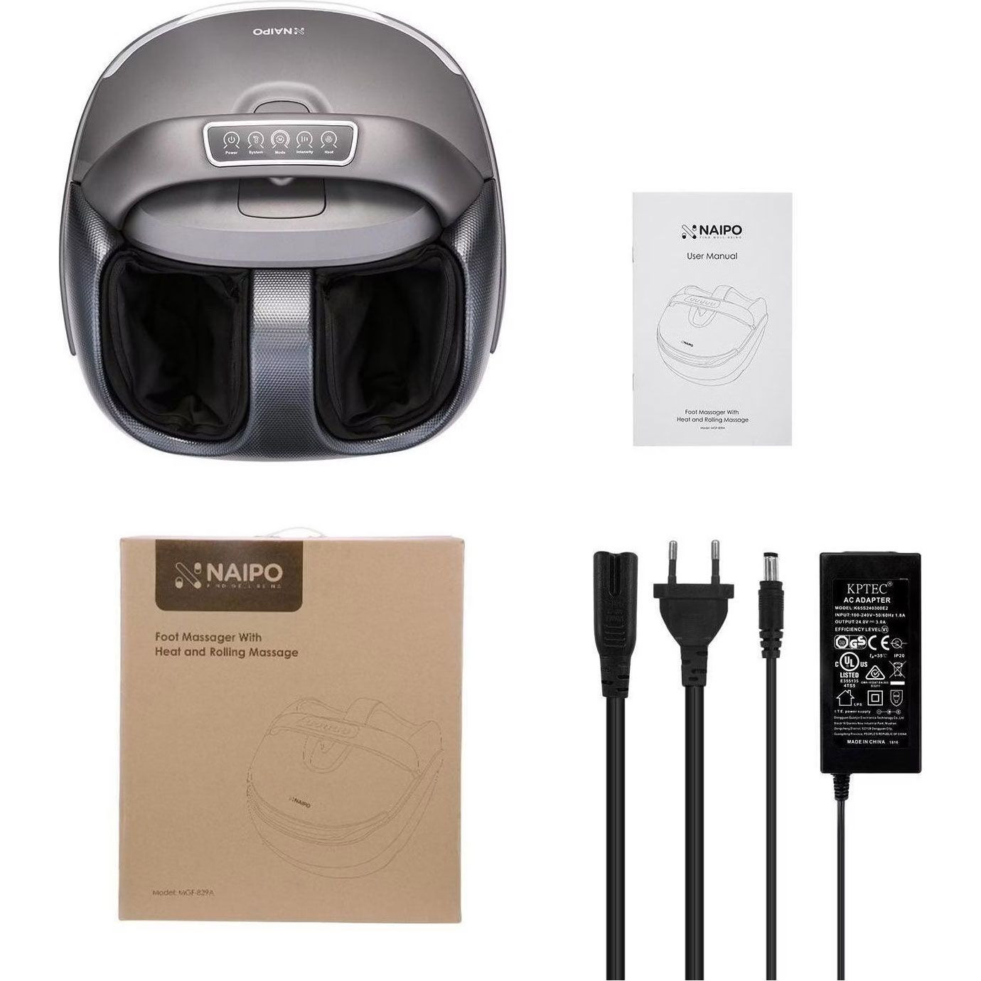 Комплектація: Масажер NAIPO MGF-839A, мережевий адаптер, посібник користувача, гарантійний талон.