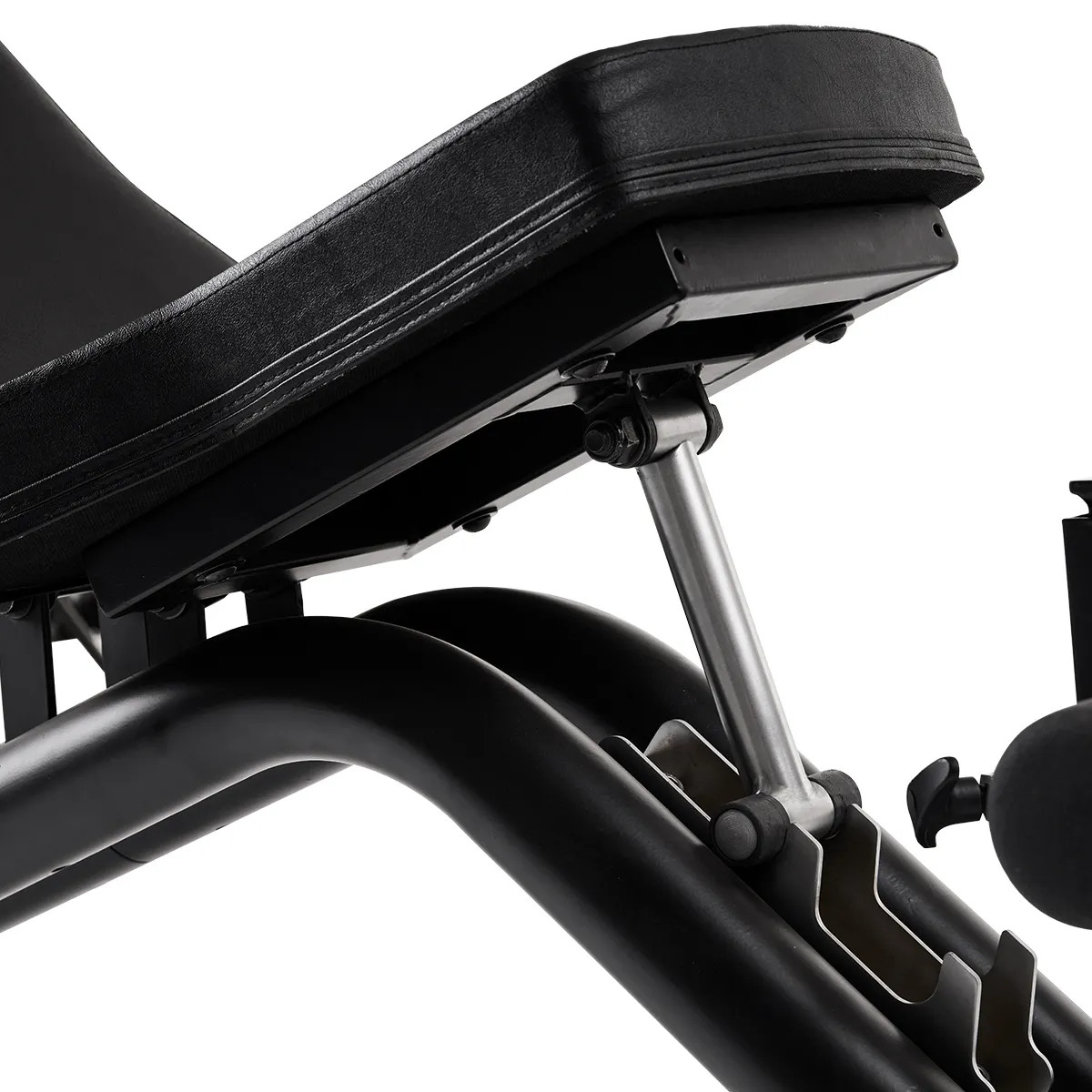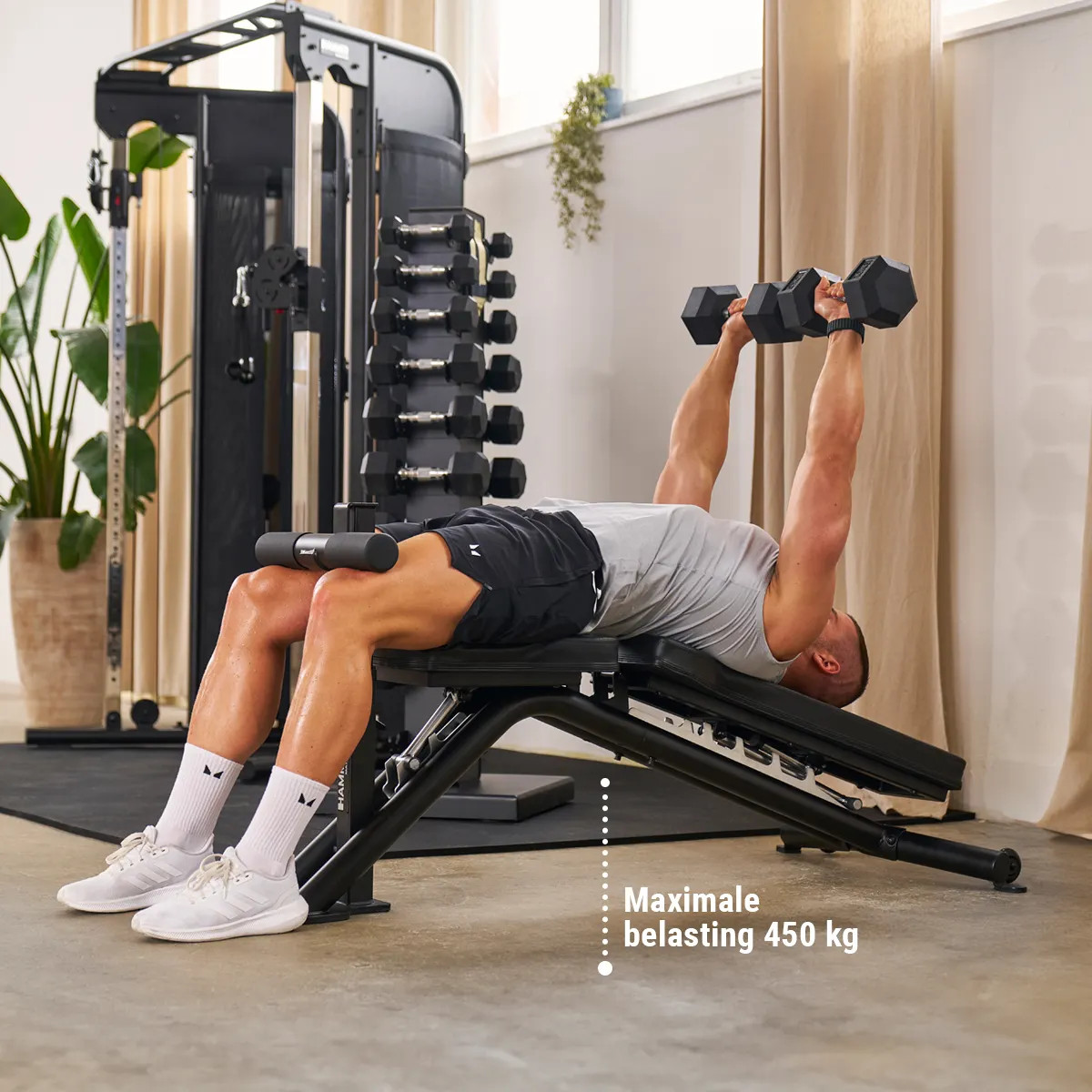 Лава для жиму Autark дозволяє проводити комплексні силові тренування для всього тіла. Завдяки міцній сталевій конструкції ви можете безпечно тренуватися з великими вагами. Регульовані подушки забезпечують оптимальний комфорт та підтримку під час виконання всіх вправ.