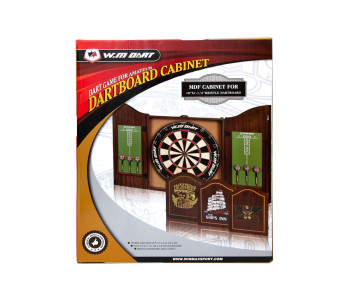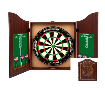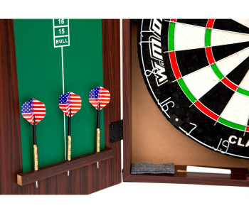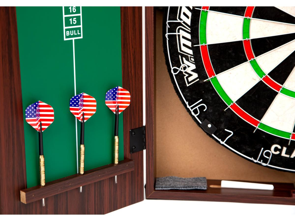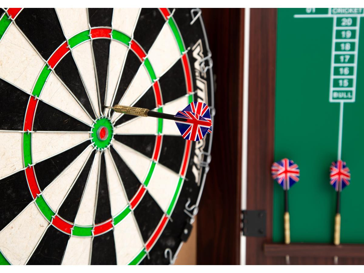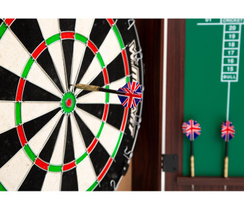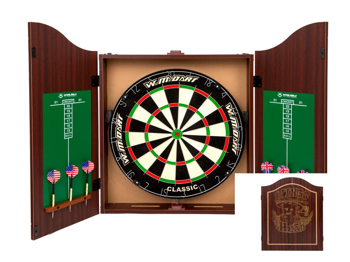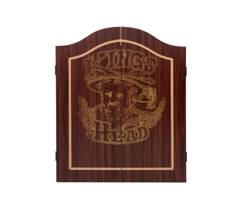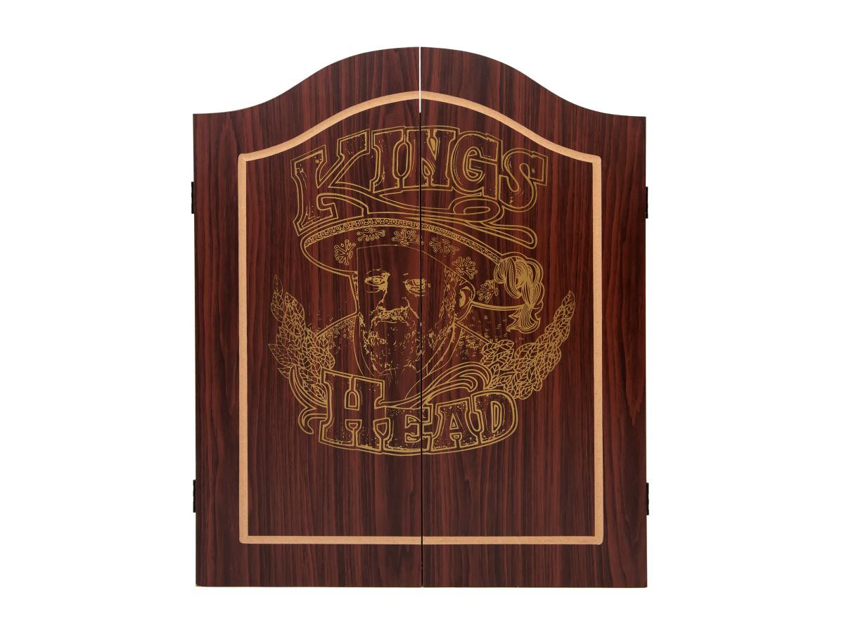 Дартс із кабінетом Kings Head виготовлений із міцного MDF. На внутрішній стороні стулок закріплені чорні розфарбовані дошки для ведення рахунку.
