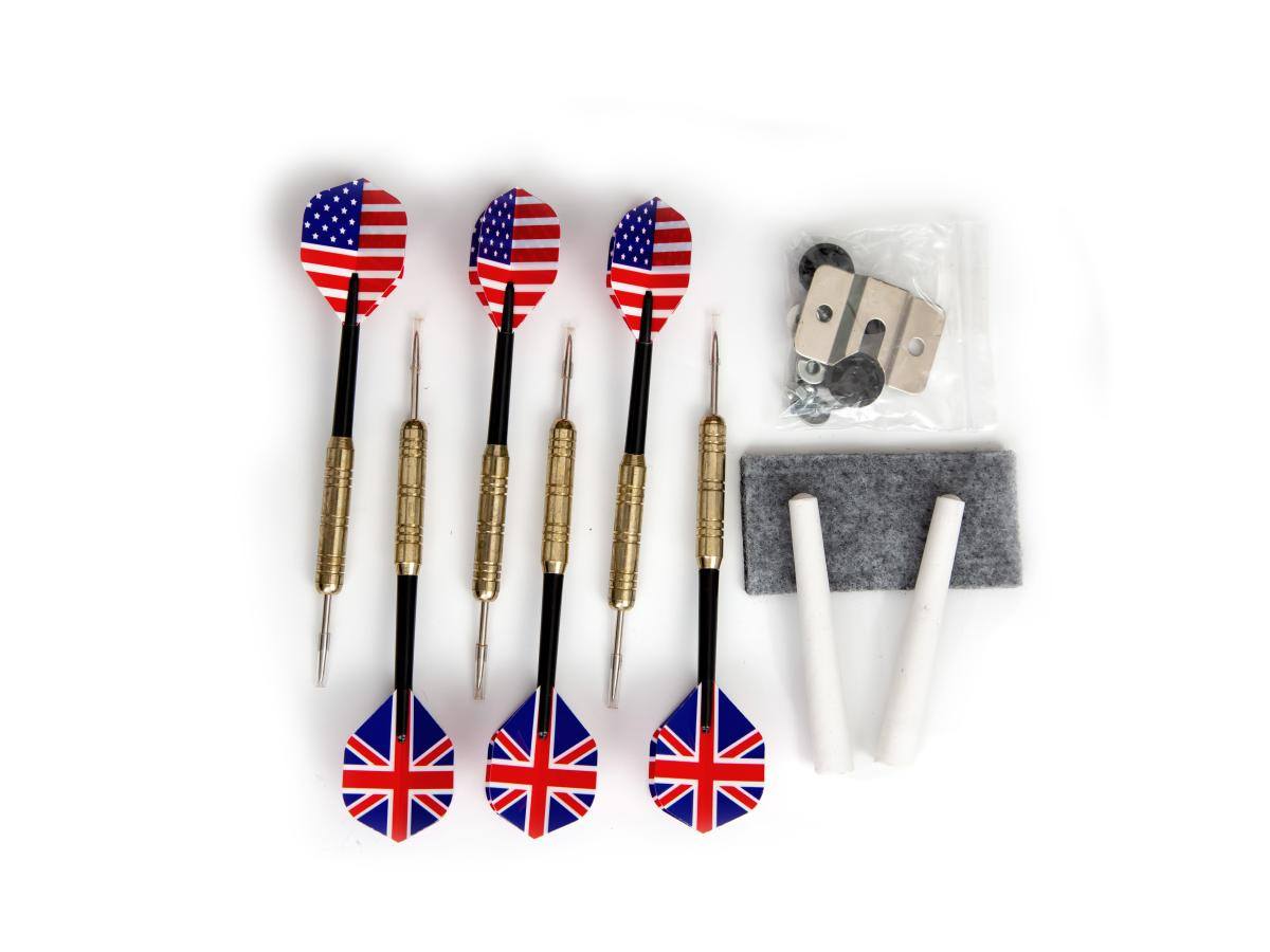 У комплекті йде набір фурнітури, що дозволяє підвісити дартс на стіну.