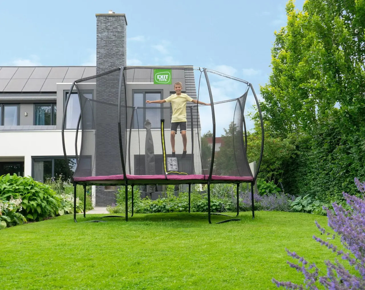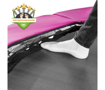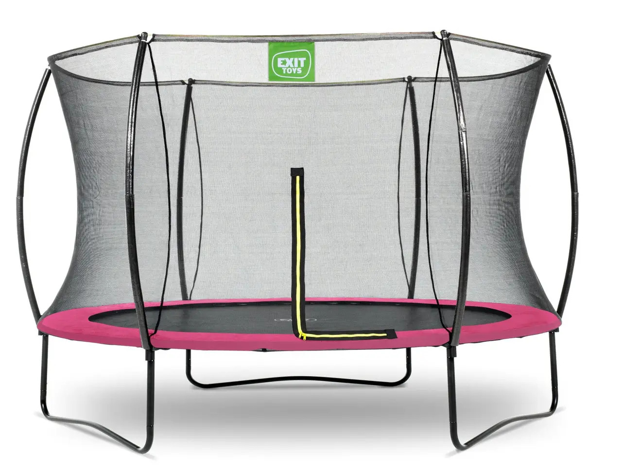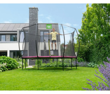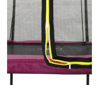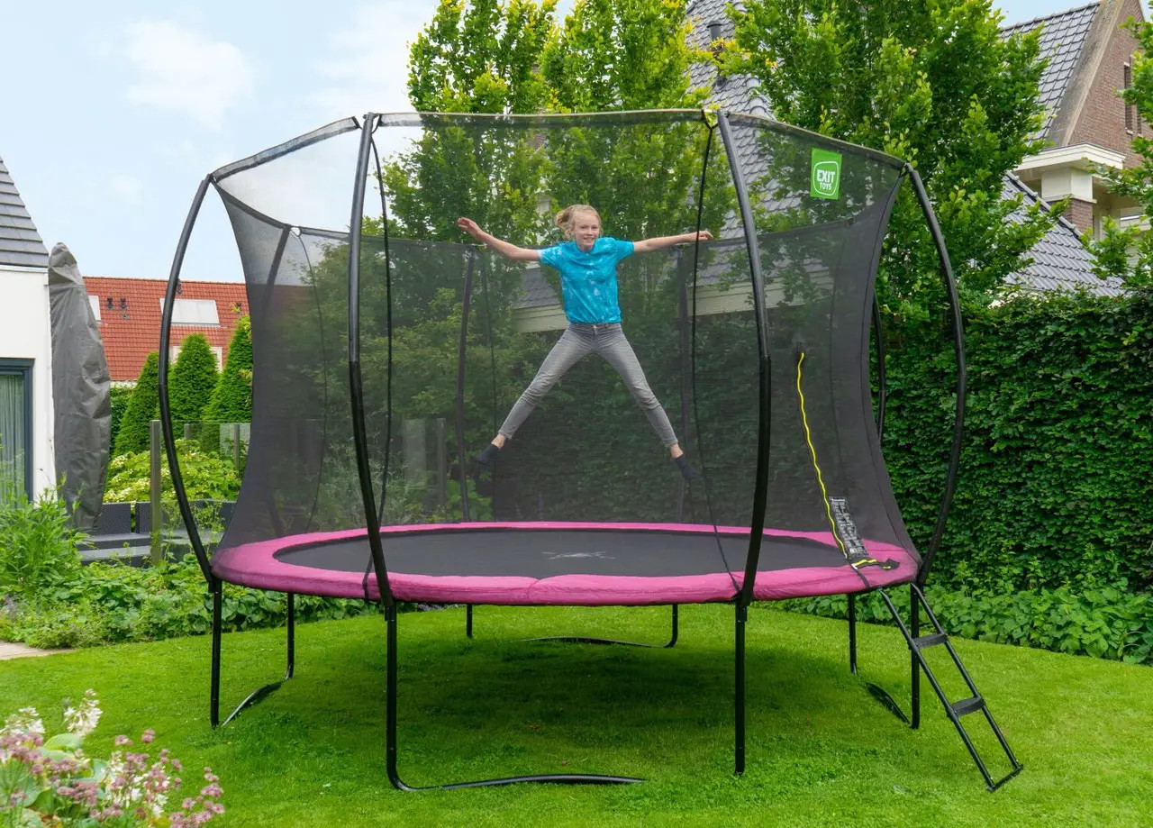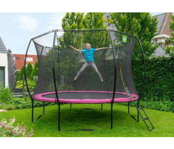Батут EXIT Silhouette 305 см рожевий - красивий, надійний, довговічний, сучасний і прекрасно розроблений, без сумнівів, буде чудово виглядати в будь-якому саду або дворі будинку. Конструкція досить стійка і поставляється в комплекті з захисною сіткою, яка зручно відкривається з допомогою флуоресцентної блискавки. Батут має контрастний чорний матовий колір з включеннями яскраво-зелених і рожевих акцентів, що робить його елегантним і привабливим.