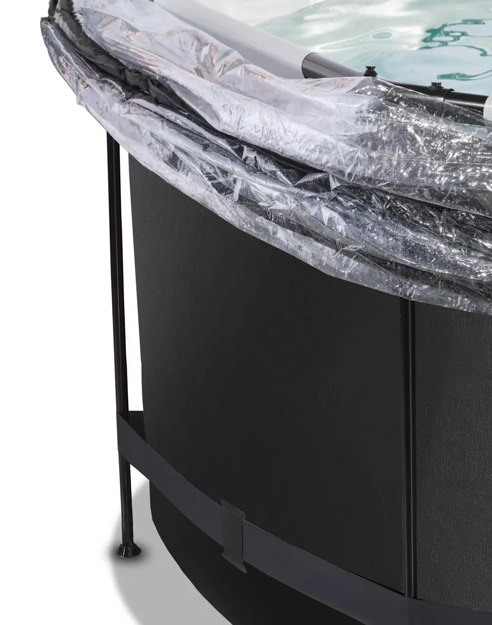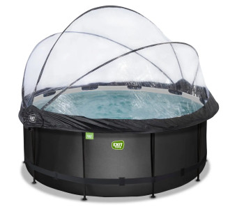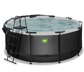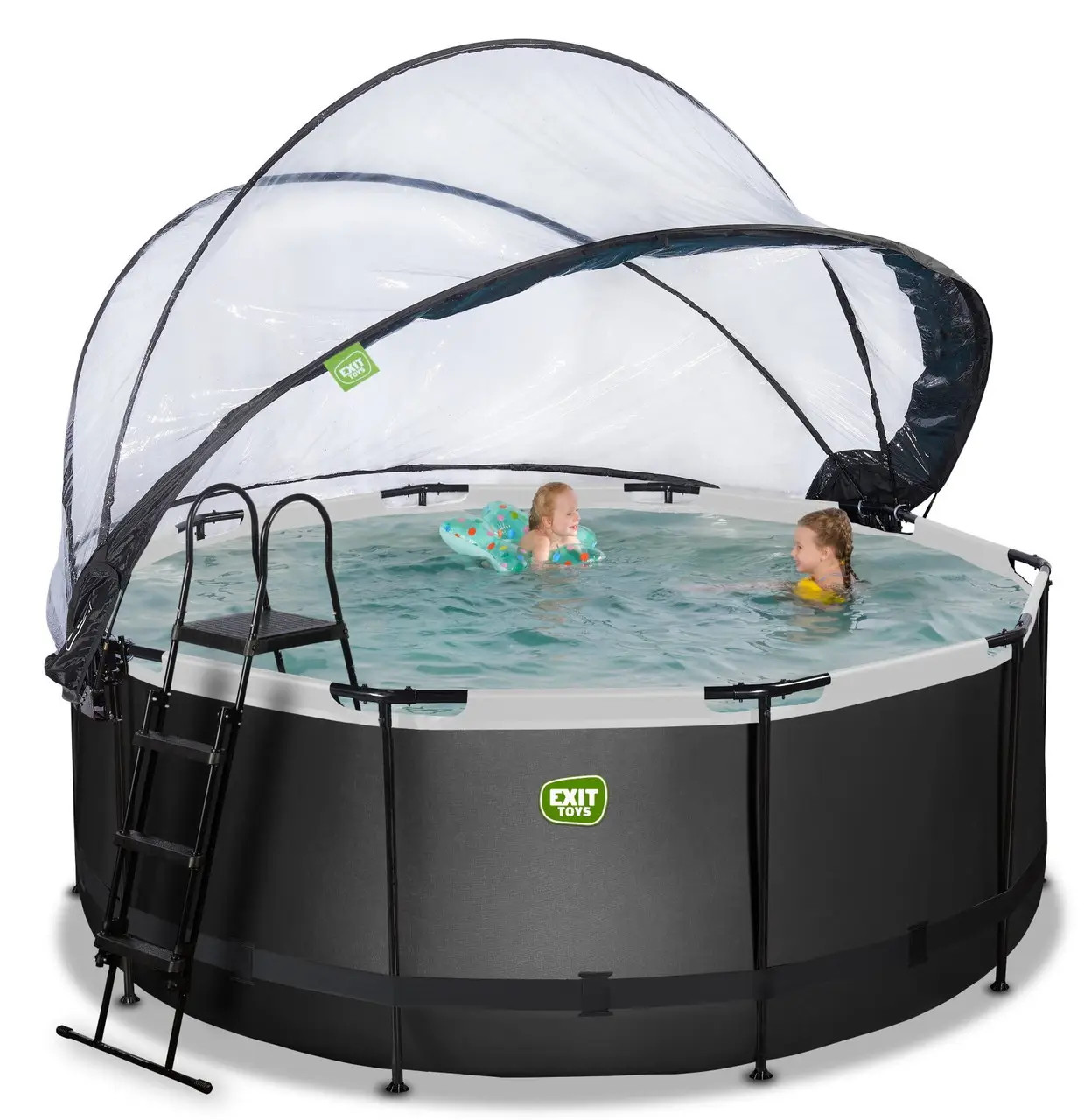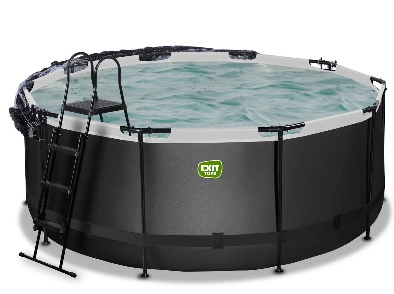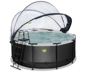 Басейн EXIT каркасний круглий с куполом 360х122 см + тепловий насос + пісочний фільтр "чорна шкіра" виглядає лаконічно і елегантно. Із зовнішнього боку - тканина з забарвленням "чорна шкіра", що зробить його розміщення в саду, на дачі або у дворі будинку особливо естетичним.