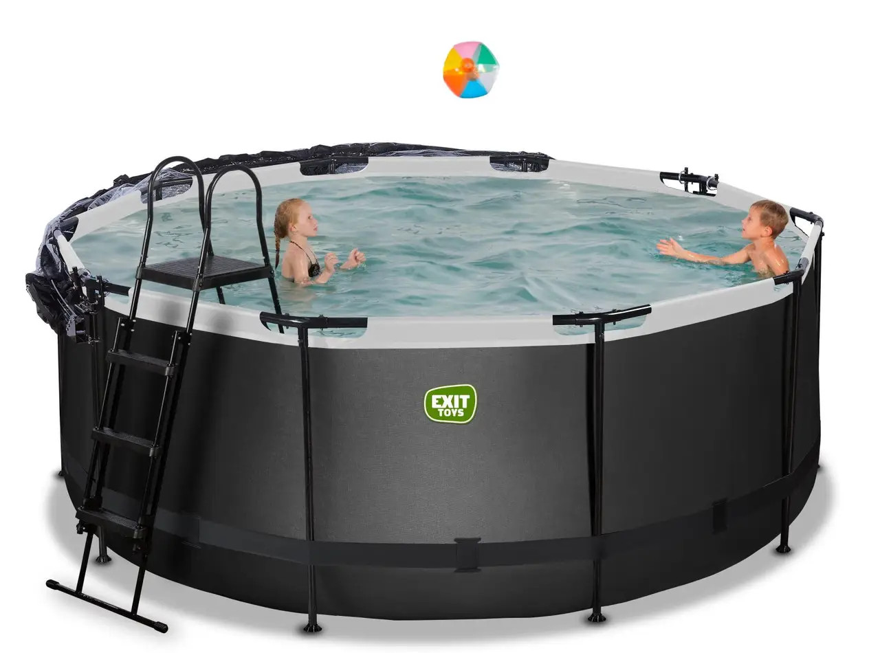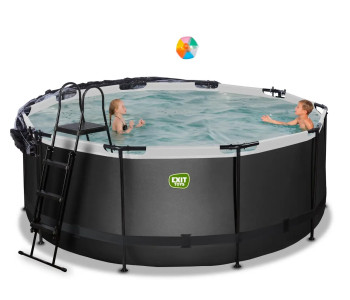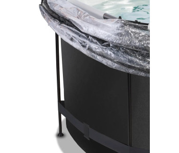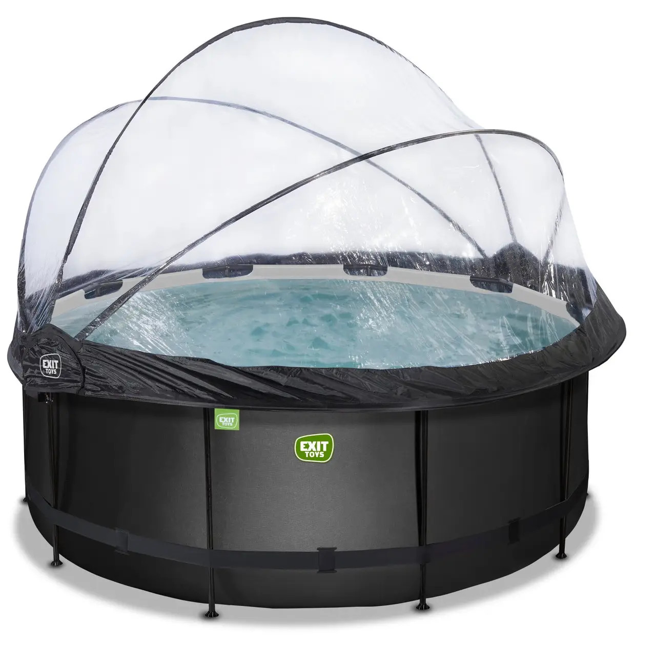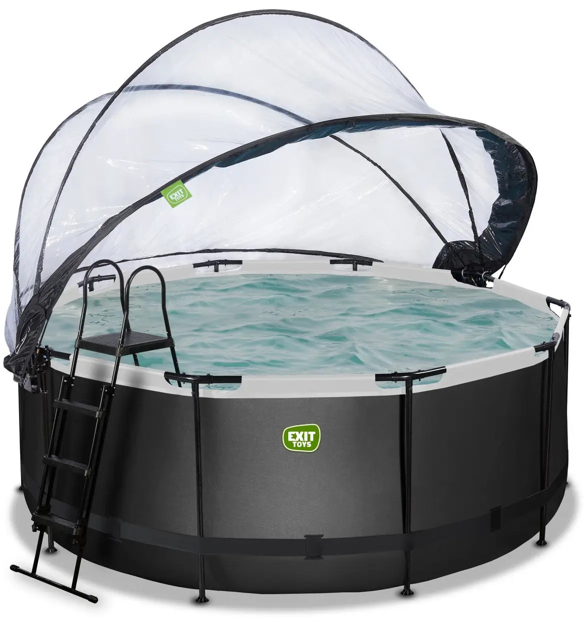 Басейн EXIT каркасний круглий с куполом 360х122 см + тепловий насос + пісочний фільтр "чорна шкіра" виглядає лаконічно і елегантно. Із зовнішнього боку - тканина з забарвленням "чорна шкіра", що зробить його розміщення в саду, на дачі або у дворі будинку особливо естетичним.