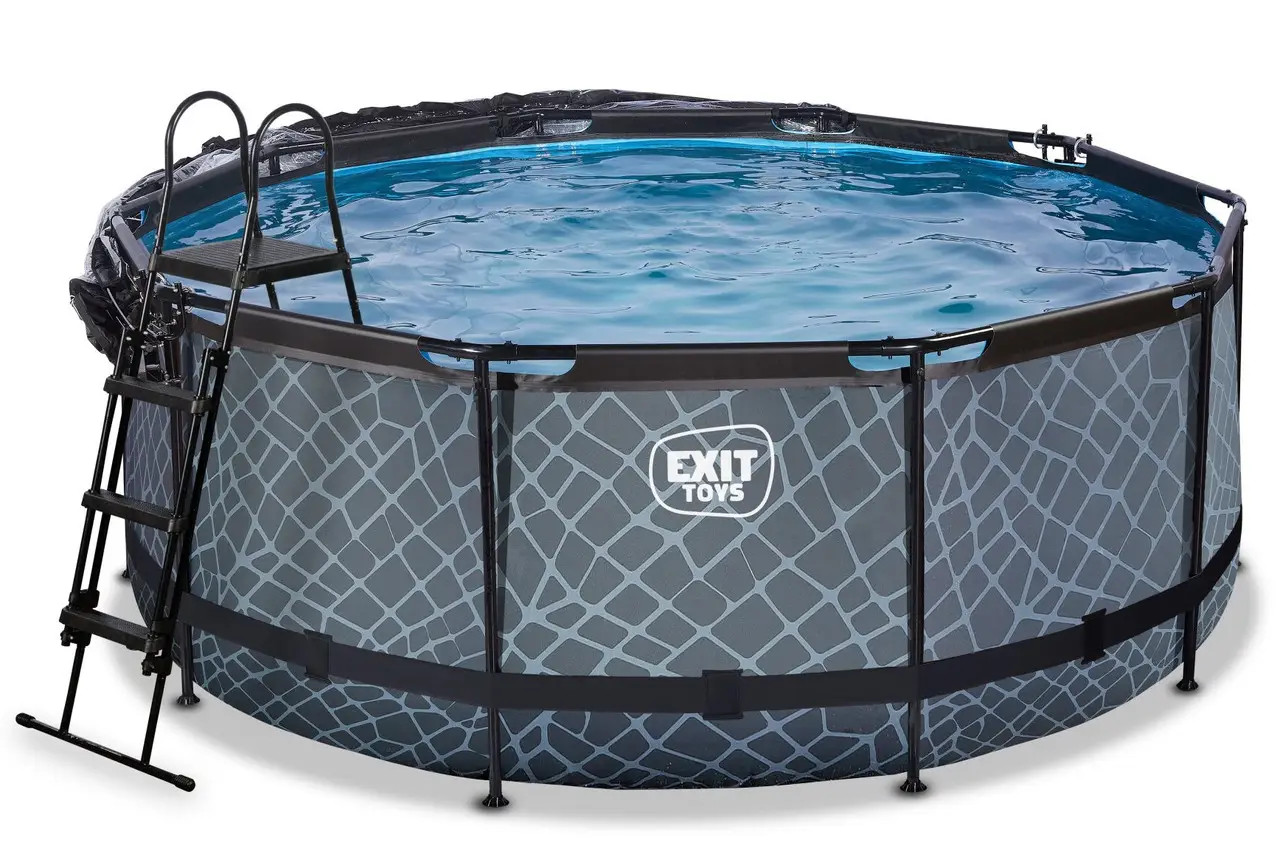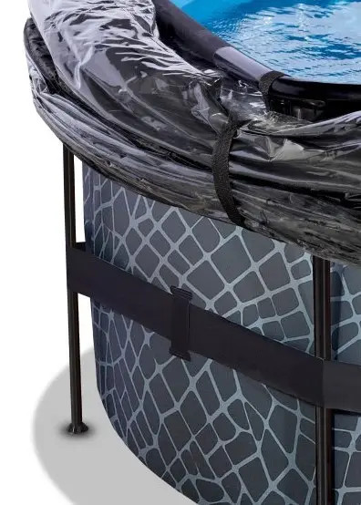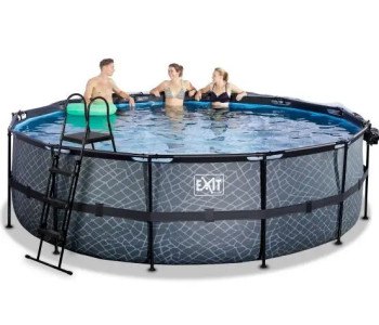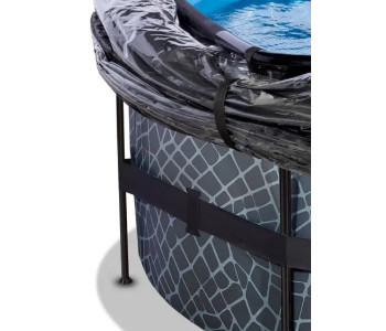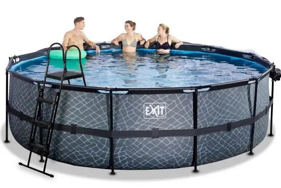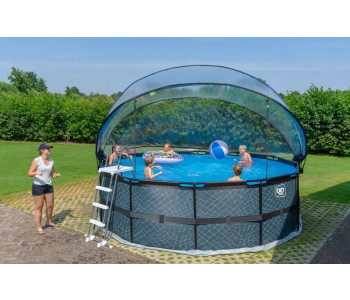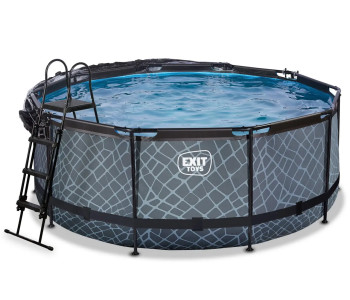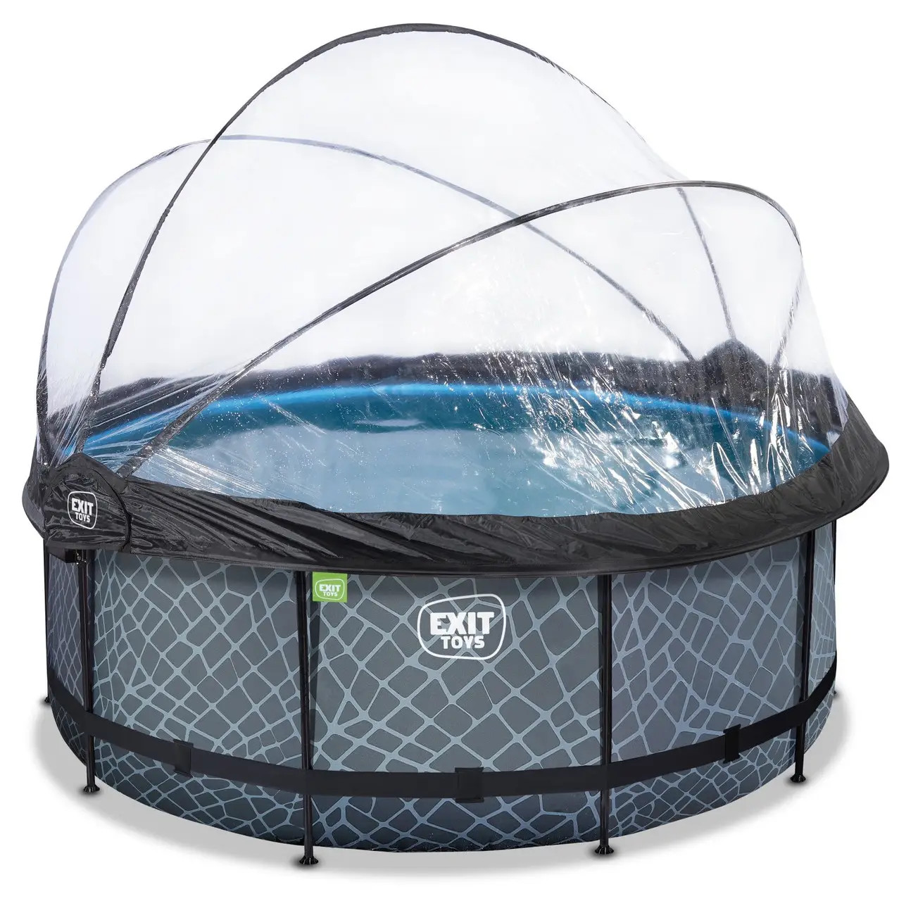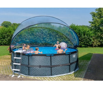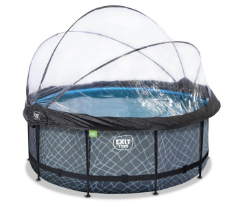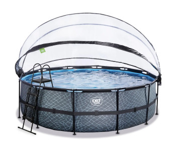 Басейн з куполом EXIT камінь 488х122 см (пісочний фільтр) виглядає лаконічно і елегантно. Із зовнішнього боку - тканина із забарвленням у вигляді кам'яної стіни, що зробить його розміщення в саду, на дачі або у дворі будинку особливо естетичним. У стандартну комплектацію входить насос з піщаним фільтром і сходи для басейну.