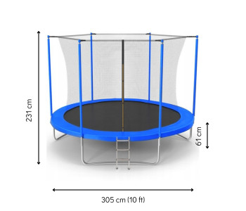 Батут діаметром 305см оснащений 54 оцинкованими пружинами стійкими до великих навантажень і забезпечують оптимальний відскок і комфорт під час стрибків. Мат батута виготовлений з високоякісних матеріалів (стійкий до ультрафіолетового випромінювання). Оцинковані ніжки забезпечують міцність, стійкість і надійність всієї конструкції. До комплекту входить драбинка для зручності.