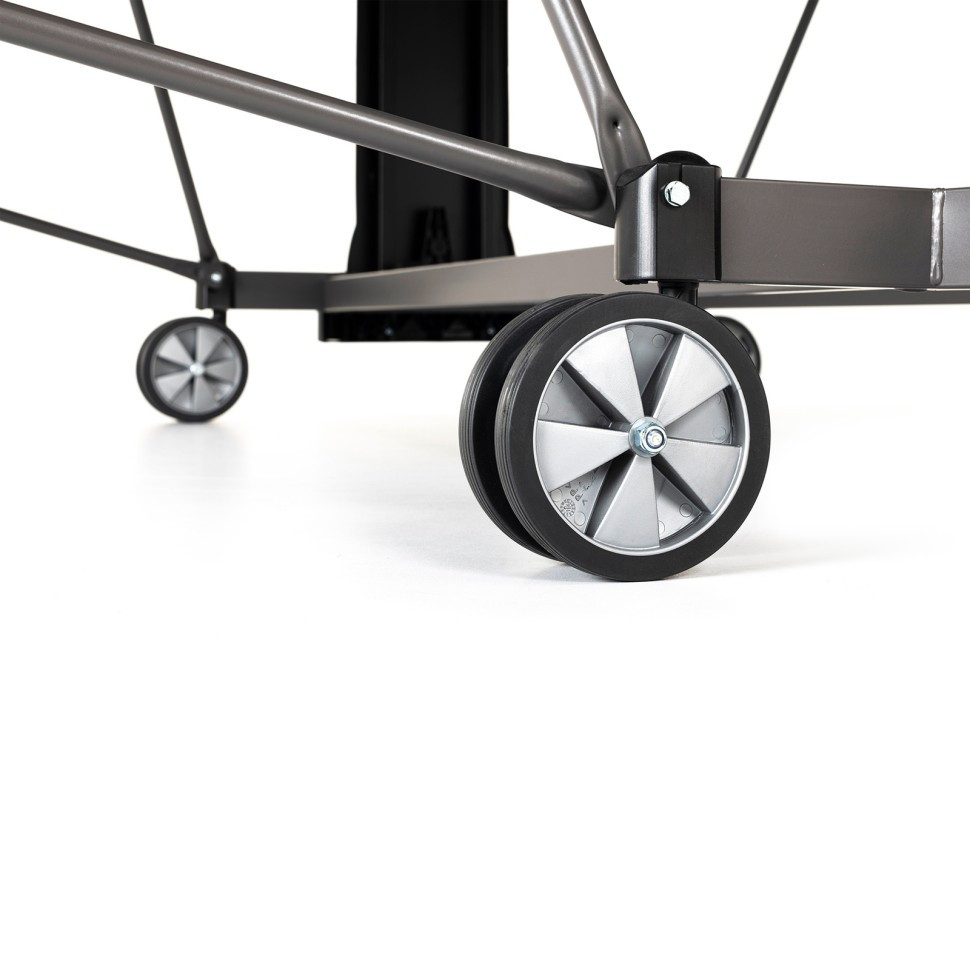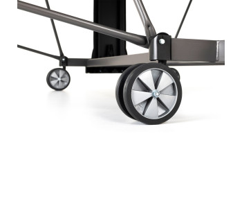 - Легке транспортування та зберігання : Завдяки чотирьом подвійним колесам з гумовими протекторами стіл легко переміщати. У складеному вигляді займає мало місця, що полегшує зберігання. Автоматичний механізм блокування забезпечує безпеку і стабільність як в розкладеному, так і в складеному положенні.
