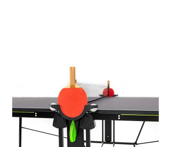 Стіл для настільного тенісу KETTLER INDOOR K1 оснащений функціональними кишенями, в яких можна зберігати ракетки та м'ячі. Кишені розташовані посередині столу, тому ігрові аксесуари завжди можуть бути під рукою. М'ячі та ракетки, зображені на фото, НЕ входять до столу.