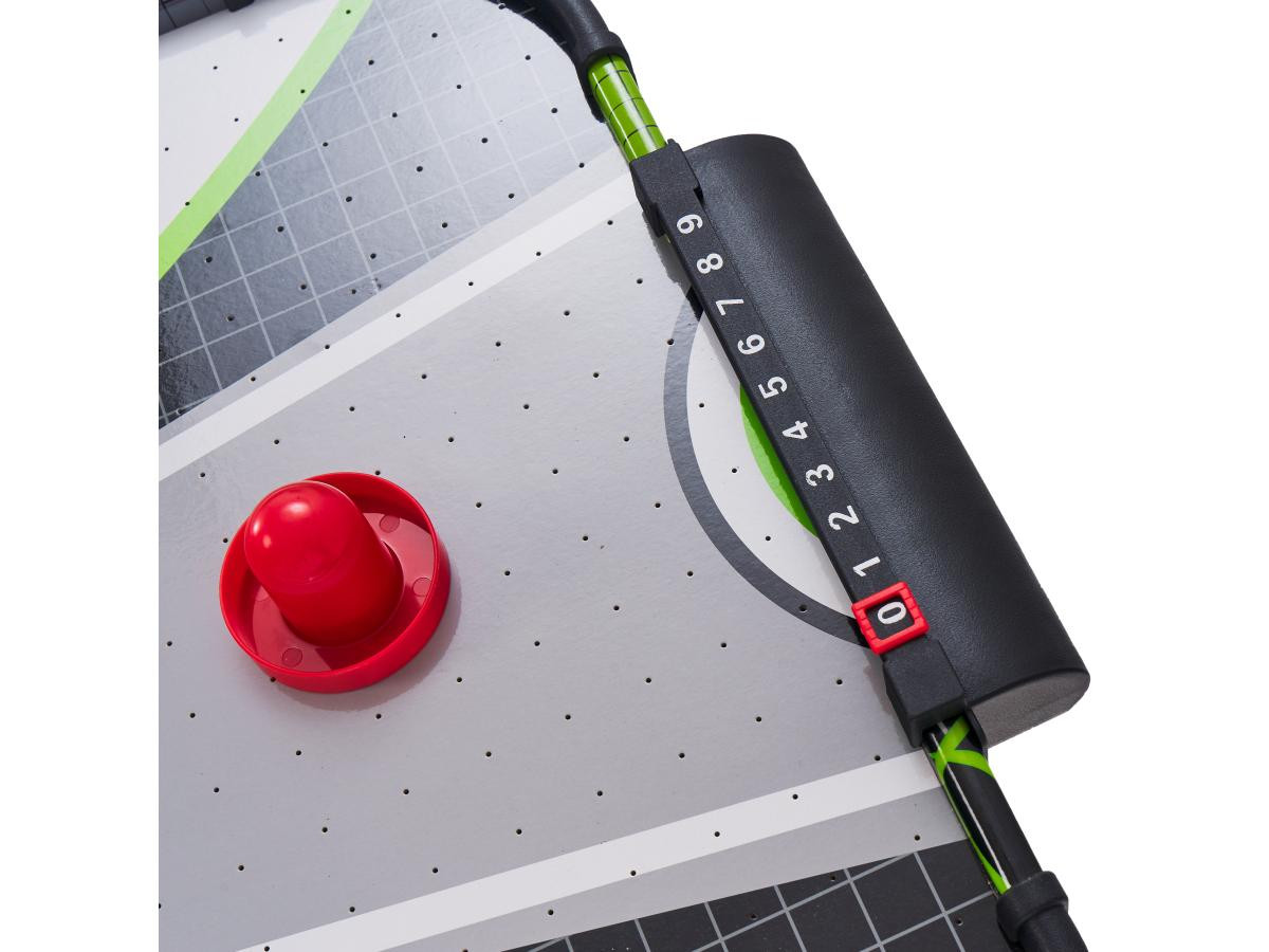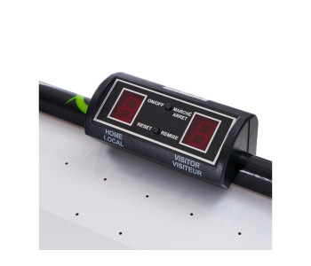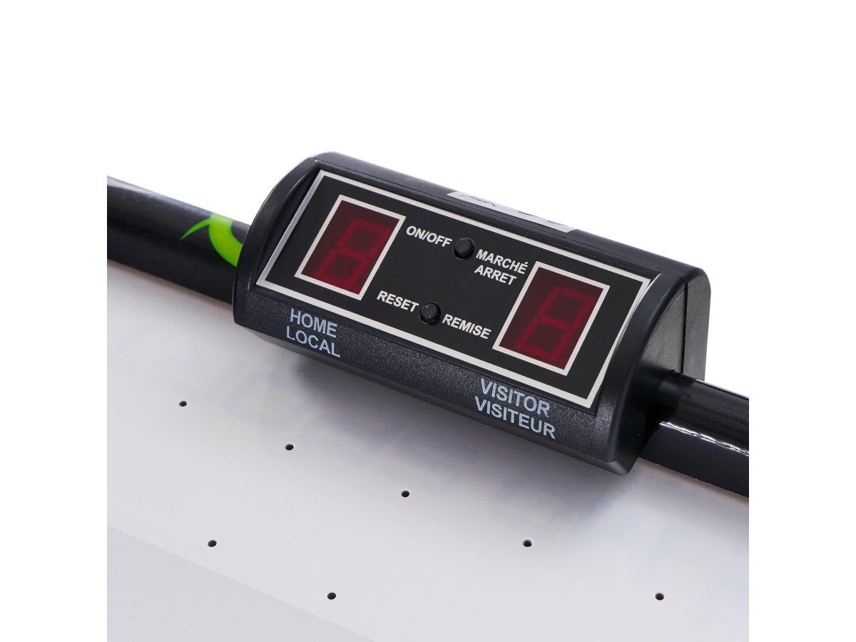 Встановлюється на підлогу, обладнано електронним табло для підрахунку забитих шайб та комплектується набором аксесуарів.