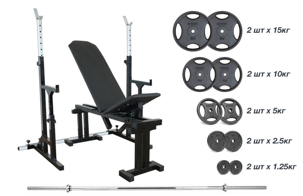 Блины изготовлены из металла. После обработки, диски разогревают в печи до температуры 180-200 градусов, окрашивают ударопрочной краской и снова запекают до формирования прочной корки. Благодаря дискам весом 1.25 кг и 2.5 кг есть возможность тренироваться с минимальным шагом веса. Удобства в использовании добавляет металлические хромированные грифы с насечкой против скольжения рук и двумя зажимными гайками, которые имеют резиновые втулки для плотной и надежной фиксации блинов.