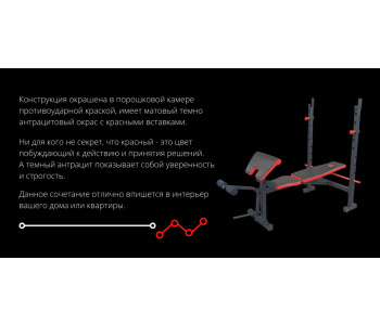 Рама тренажера виготовлена з металевого профілю 50х50мм, а м'які частини із зносостійкого поролону та якісної шкіри замінника. Прошивка оббивки із міцної вінілової шкіри виконана подвійним швом. Для зручності та комфорту під час тренувань, спинка та сидіння оббиті Сіткою air-mesh. Така конструкція забезпечує міцність, постійну циркуляцію повітря. Вона надає амортизуючі властивості.