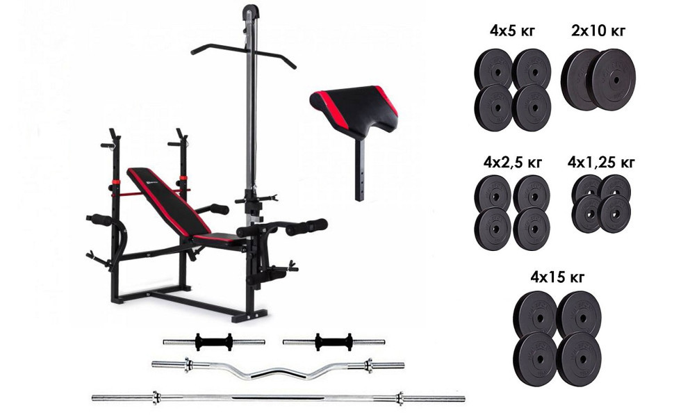 Скамья с тягой и тренажерами + 4 грифа + 115 кг дисков с ABS покрытием